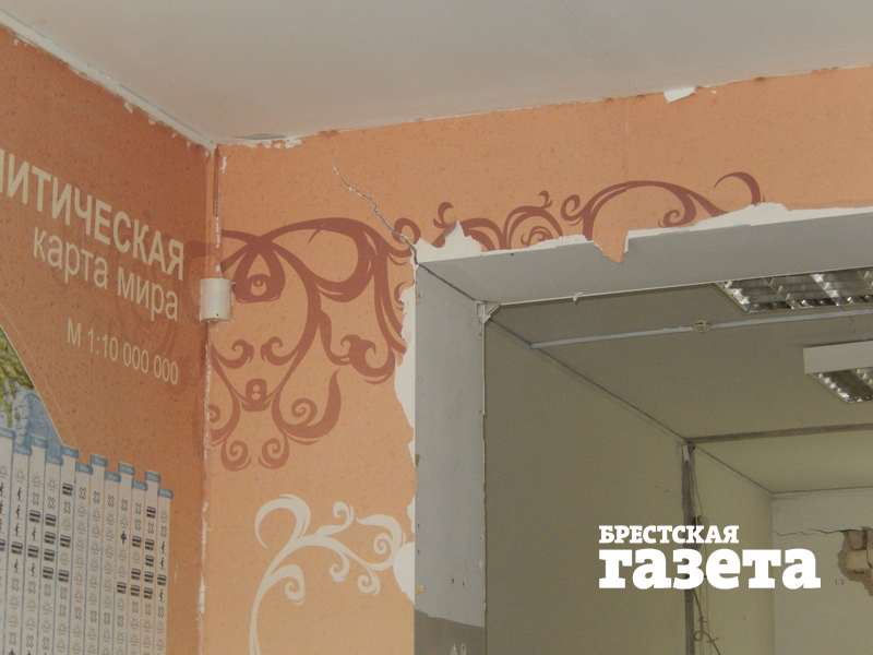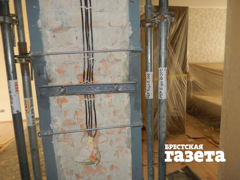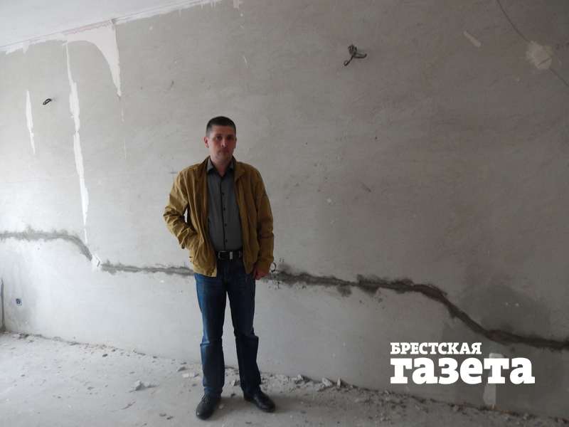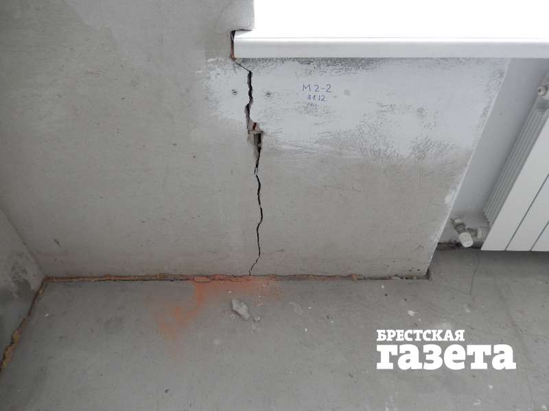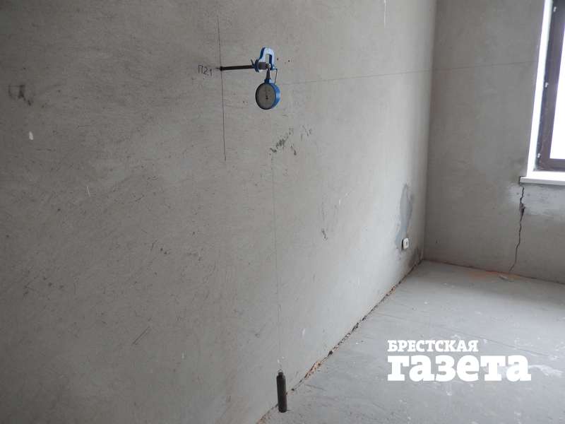 Вместе с Николаем Костенко корреспондент «БГ» поднялась на второй этаж и прошла в квартиру №2. Как пояснил председатель товарищества, ее владелец находится сейчас за границей, а в опустевшей квартире проводятся некие испытания. На стенах огромные, неаккуратно, будто наспех замазанные продольные трещины и еще множество поменьше в разных местах. Стены расчерчены на квадраты, на них установлены какие-то штуки, отдаленно напоминающие часы, посреди комнаты примерно на уровне человеческого роста натянут тонкий провод с грузилом на конце.