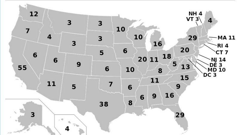 Каждый из 50 штатов, в зависимости от численности проживающего в нем населения, посылает в коллегию от 3 до 55 выборщиков. Также город Вашингтон представлен еще тремя выборщиками.