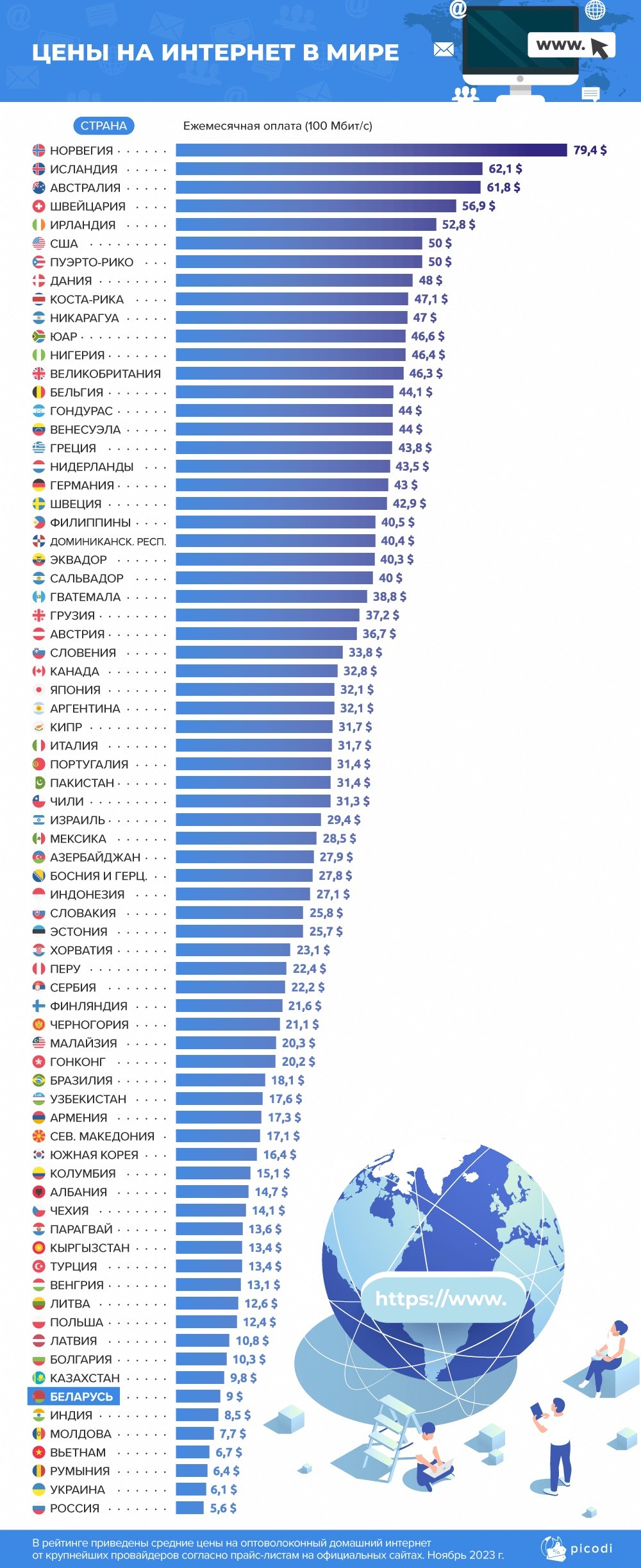 Беларусь расположилась в нижней половине рейтинга: за 100 Мбит/с в среднем мы платим 9$ в месяц. Среди беларуских интернет-провайдеров такая скорость соединения также является самой популярной, как и в среднем по миру.