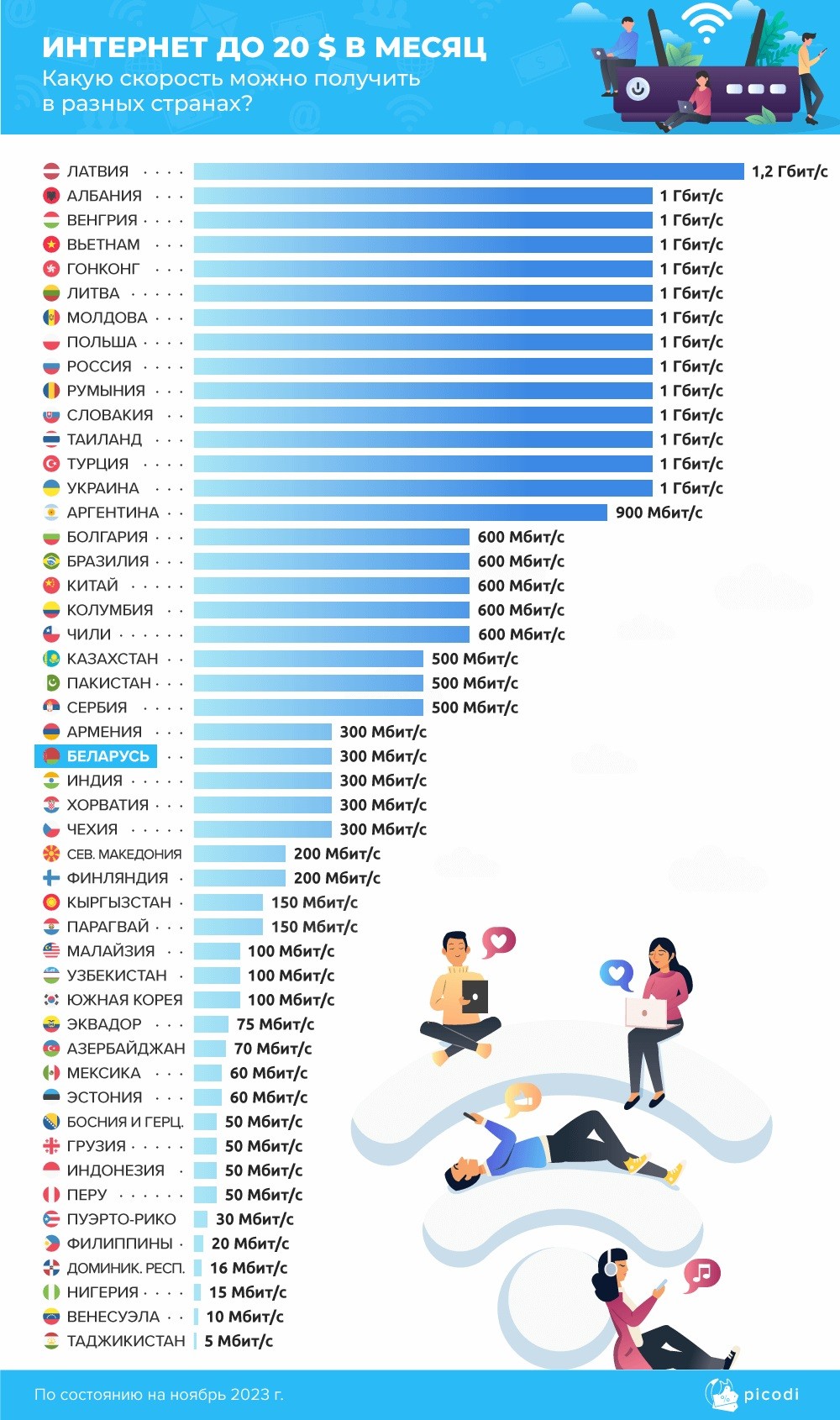 Согласно собранным «Picodi Беларусь» данным, самое популярное соединение, предлагаемое операторами, — это 100 Мбит/с. Ведь 74 из 85 провайдеров имеют такую скорость в прайс-листе. А в таких странах как Испания, Китай, Сингапур и Франция уже не предлагают такой «медленный» интернет.