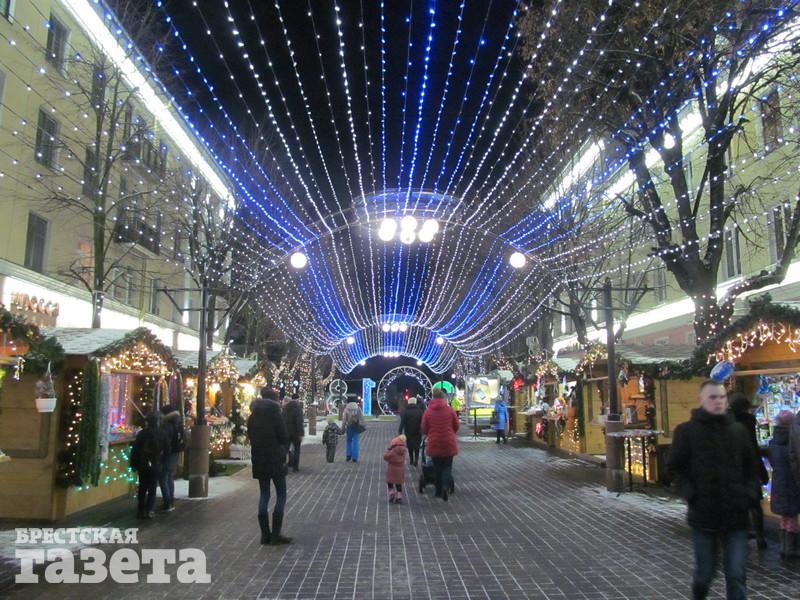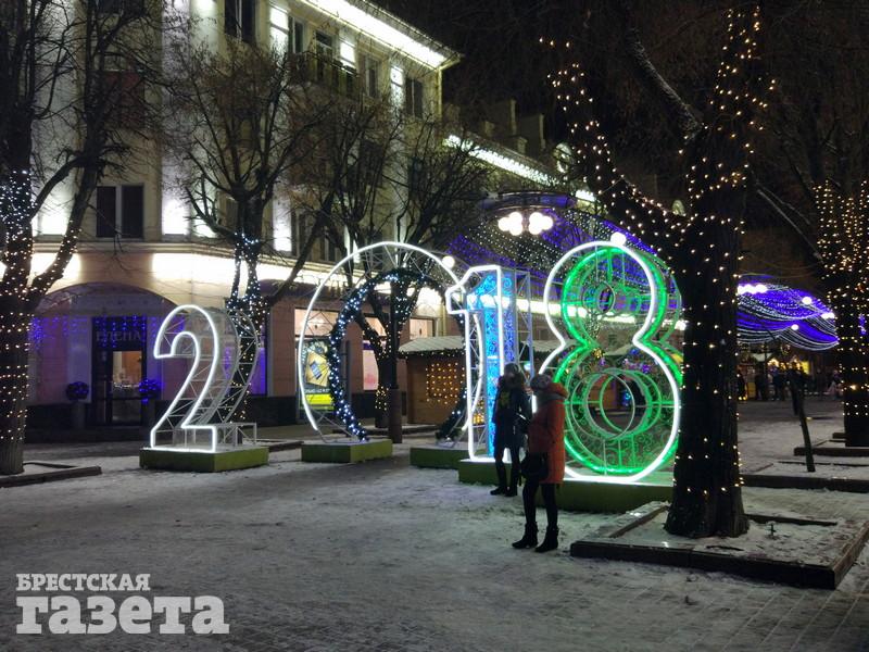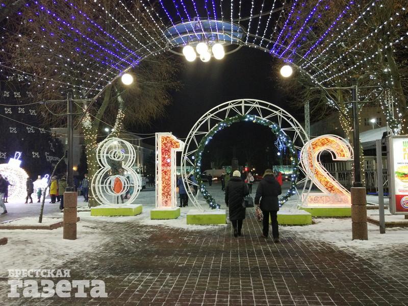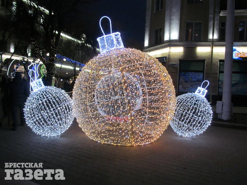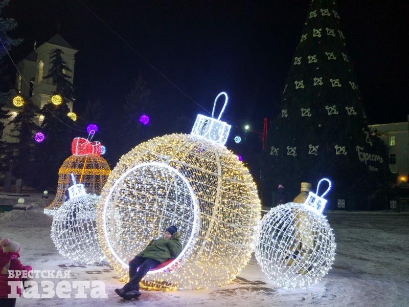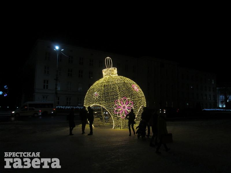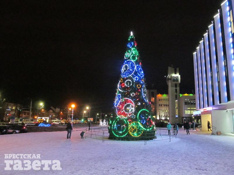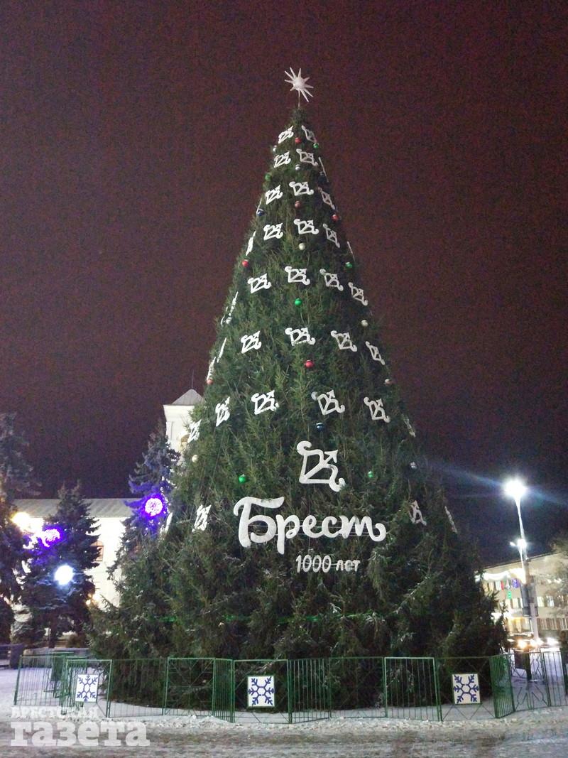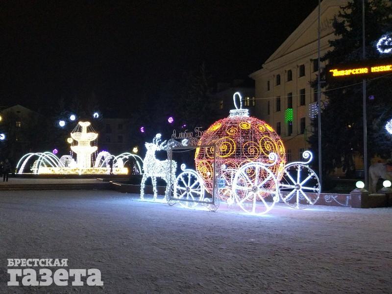 Сейчас можно увидеть, что елку украсили логотипами к 1000-летию Бреста, но она пока не светится. На площади уже установили карету, запряженную оленем, новогодний шар, колокольчик с язычком, который двигается из стороны в сторону.