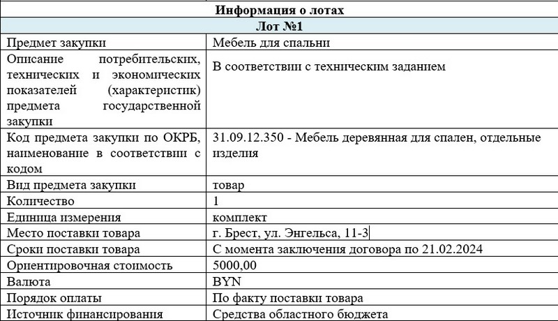 В начале февраля Брестский облисполком разместил на сайте госзакупок запрос на покупку двуспальной кровати. Заявку закрыли 14 февраля, а поставить кровать с двумя прикроватными тумбами в квартиру №3 в доме на улице Энгельса, 11 нужно было к 21 февраля. За кровать заплатили 5 000 рублей. Она выглядит примерно так.