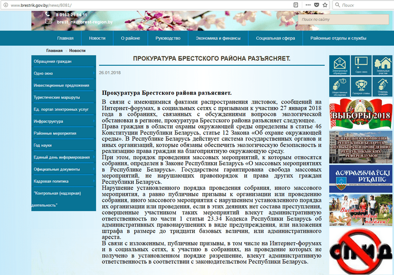 В пятницу 26 января на сайте Брестского райисполкома появилась информация под заголовком «Прокуратура Брестского района разъясняет». Как следует из текста, поводом для публикации стали факты распространения листовок, сообщений на интернет-форумах, в социальных сетях с призывами к участию 27 января в собраниях, связанных с обсуждениями вопросов экологической обстановки в регионе.