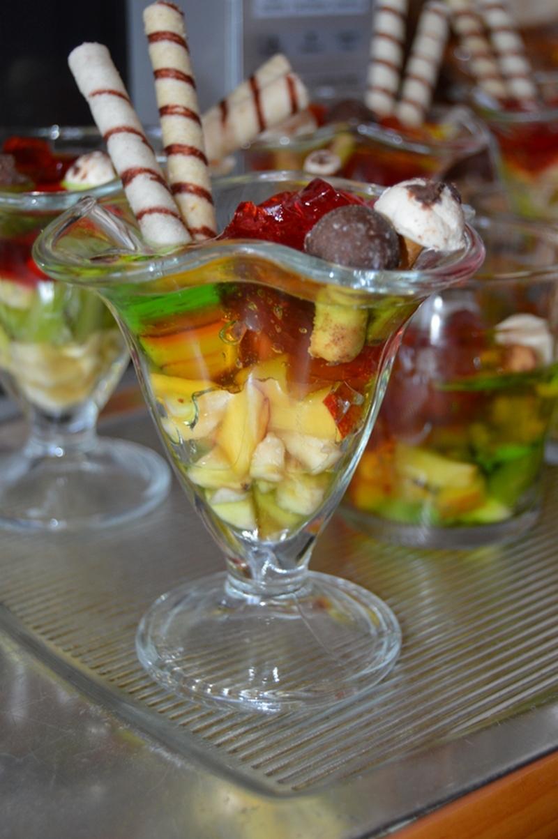Понадобится 4 пачки полуфабриката для желе (разных вкусов), 1 нектарин, 1 банан, 1 киви, печенье «Грибочки», вафельные трубочки.