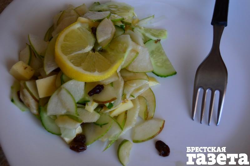 Для рецепта пригодятся 2 средних огурца, 2 груши, 100 г сыра, 50 г изюма, 1 ч. л. меда, 0,5 лимона.
