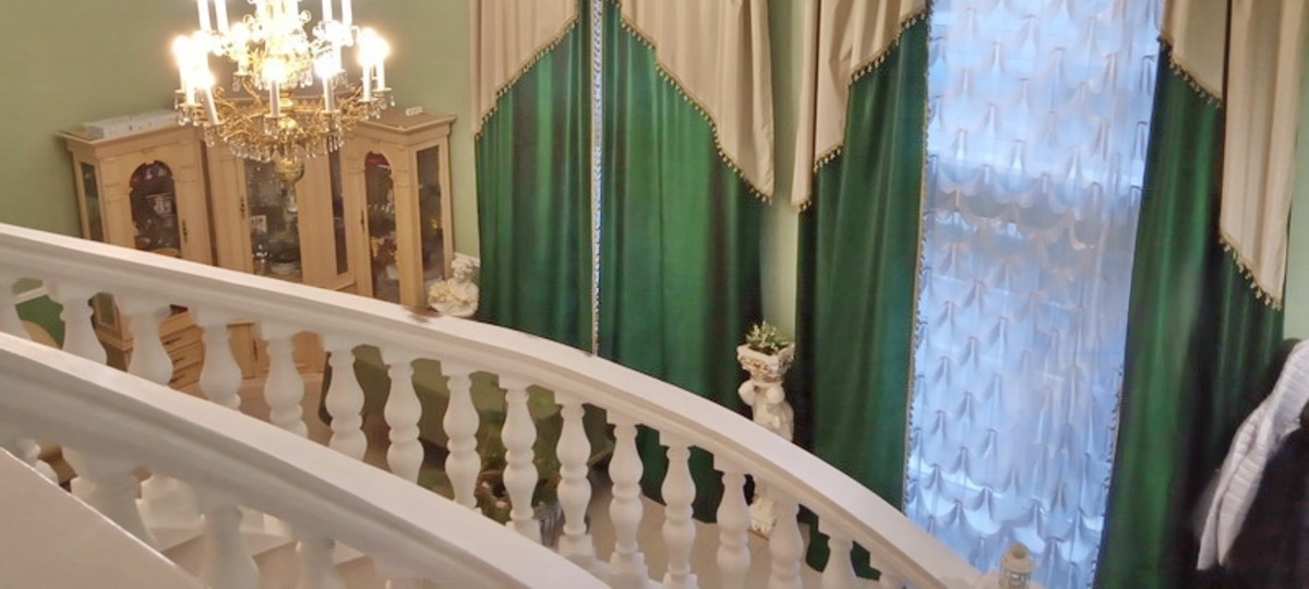 Интерьер дома местами полностью соответствует экстерьеру. Но, обо все по порядку. Первое, что бросается в глаза, — белоснежная лестница на опорных колоннах. Прям как в лучших домах Лондона и Парижа. Гостиная, оформленная в богемном стиле, не отстает. Зеленый цвет стен, объемные шторы, высокие арочные окна, массивная позолоченная люстра, лепнина на потолке — чем не зал для балов?