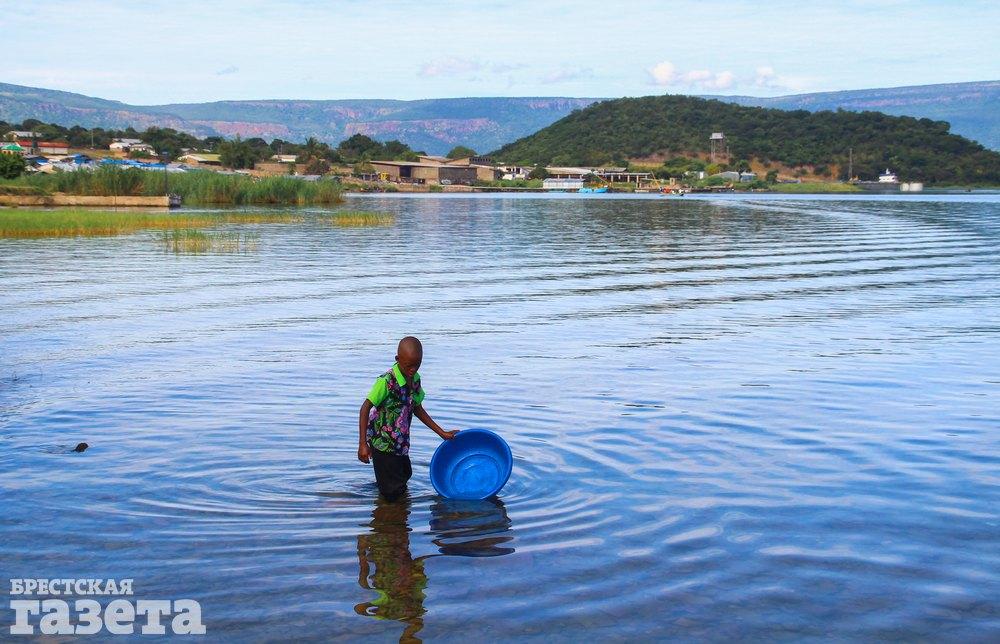 Замбийский мальчик ловит мелкую рыбку тазиком. Он зачерпывает воду и несет тазик на берег, где сливает воду на песок и собирает прыгающих по земле рыбок.