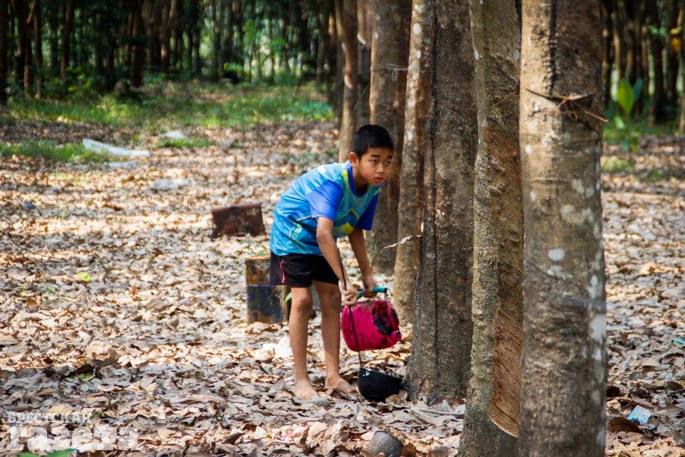 Тайский мальчик помогает своим родителям на плантации каучуковых деревьев. Таиланд — лидер по производству натуральной резины, и этим занята большая часть населения. Работать обычно приходится ночью, потому что сок деревьев в это время жидкий и с ним проще обращаться. Плюс не так жарко, как днем. На каучуковых плантациях обитает много ядовитых змей. Яд некоторых из них смертелен для человека. Поэтому работают обычно в длинных резиновых сапогах и с палкой, чтобы прощупывать почву перед собой. Этот мальчик работал босиком.
