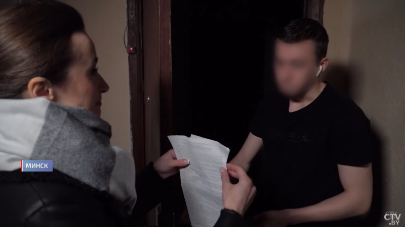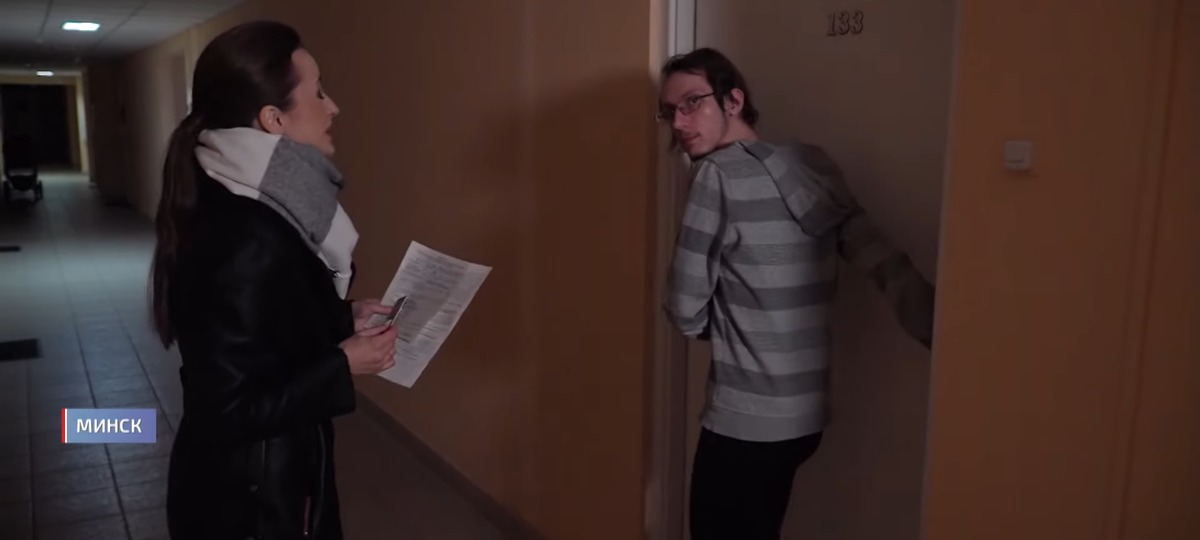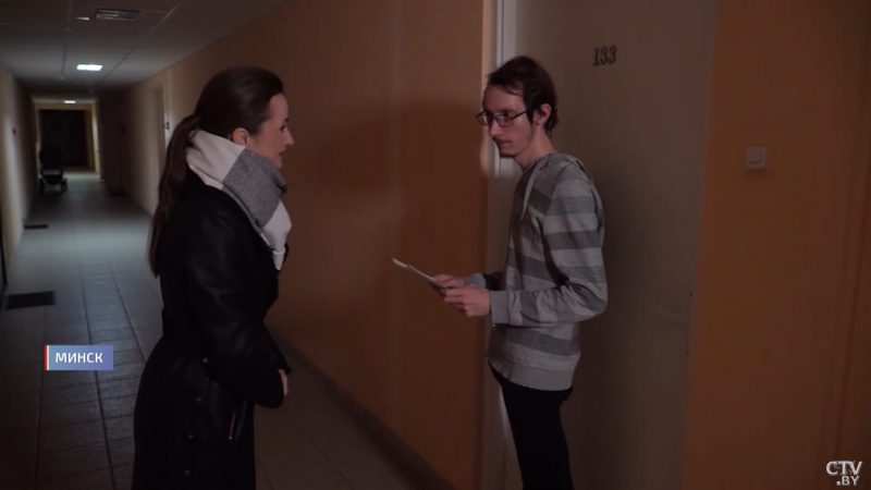 Зато сотрудница телеканала осуществила задуманный план и в конце сюжета все-таки вручила повестку с широчайшей улыбкой на лице. А вот адресат, студент БГУИР Кирилл, к ее появлению явно отнесся настороженно.