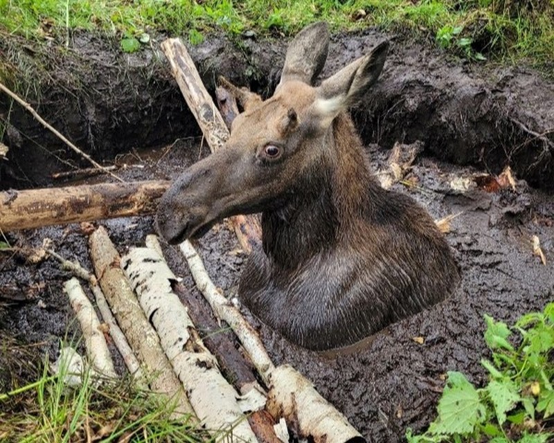 При помощи подручных средств и веревки спасателям удалось достать животное из канала. Немного отлежавшись после испытания, молодой лось встал на ноги и убежал в лес. Но его фото стало мемом.