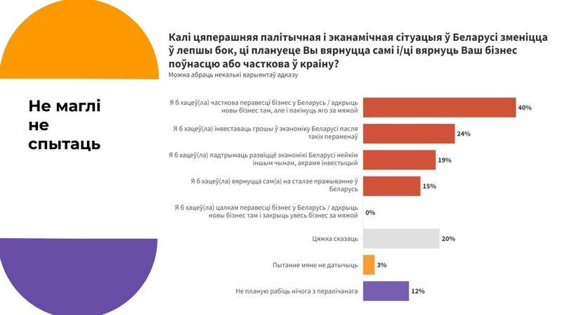 Полноценно рассматривать Беларусь в качестве страны для жизни можно тогда, когда ты понимаешь, какие там созданы условия. Если завтра там сменится власть и будут созданы отличные условия для ведения бизнеса, я думаю, что этот процент будет далеко не 15%. Все зависит от того, как мы вместе будем строить условия для ведения бизнеса в стране.