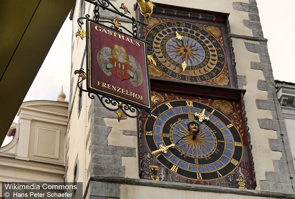 На ней несколько циферблатов: нижняя пара датируется XVI веком и содержит, кроме часов, солнечный и лунный календари. На самом здании сохранилось несколько старинных деталей — портал, эркер, балкон.