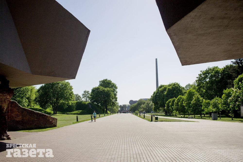 Прогулку по мемориальному комплексу мы начинаем со знаменитой «Звезды». Многие думают, что раньше тут находились Восточные ворота Брестской крепости, которые после войны оформили в символический проход. На самом деле, отмечает Елена, ворота находились правее. В нынешнем виде вход появился, только когда в сентябре 1971 года открыли мемориал. Передовую для того времени идею звукового оформления позаимствовали у мемориального комплекса на Мамаевом кургане.