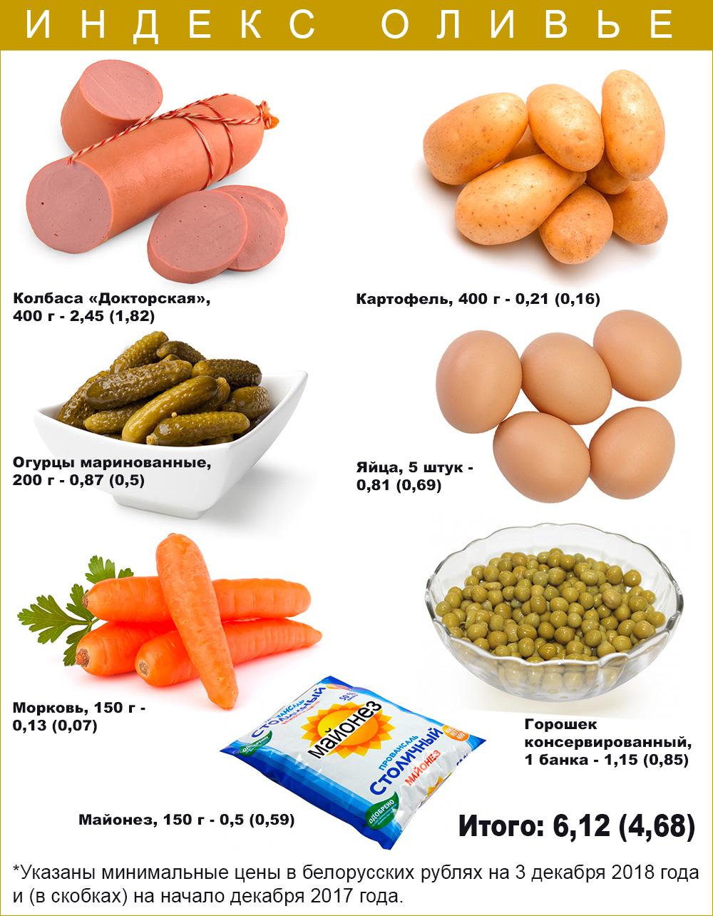 В итоге получилось, что миска оливье для брестчанина обойдется минимум в 6,12 белорусского рубля, что на 30% больше, чем в прошлом году.