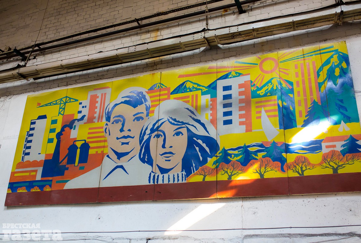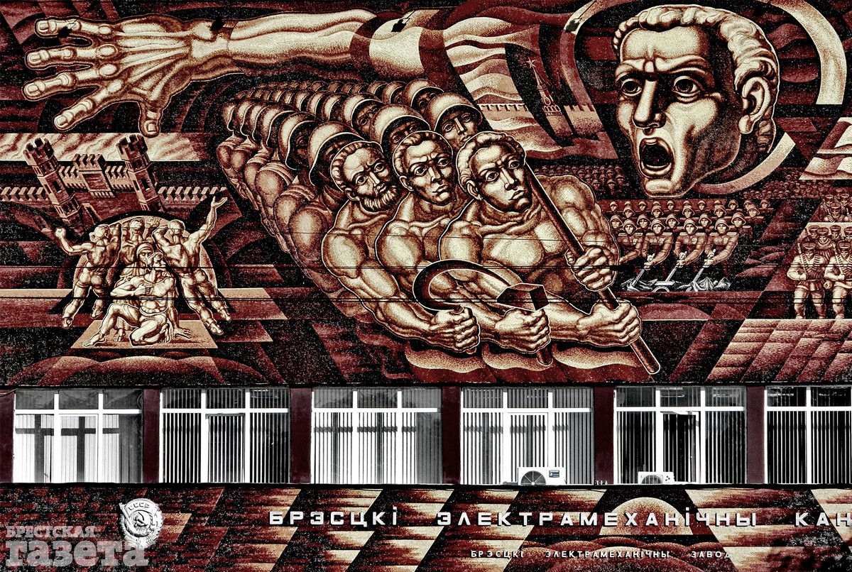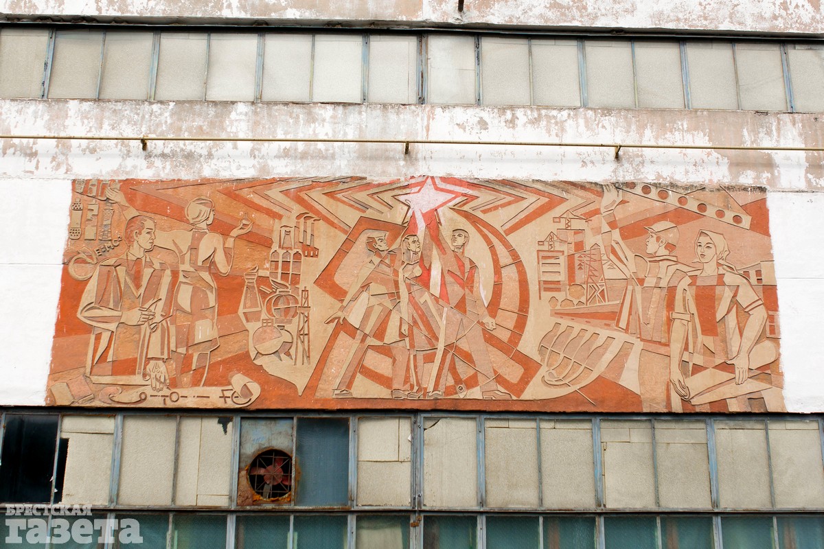 Панно на фасаде одного из производственных цехов брестского химзавода – своеобразный триптих, выполненный в технике росписи по рельефу. Центральная его часть – главная идея: стремление к светлому будущему, к коммунизму. Все остальное подчинено только этой цели. Слева показаны собирательные образы ученых и работников химпрома, которые трудятся для того, чтобы повысить общую эффективность других производственных сфер (фабрик, заводов, строек).