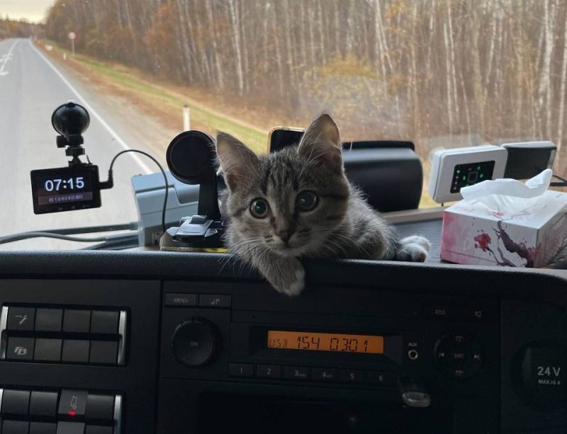 Жителю Барановичей Виталию Коновалику 36 лет. В середине сентября, находясь в очередном рейсе где-то между Уфой и Челябинском, он случайно увидел на заправке худую, ужасно голодную маленькую кошечку. Он пожалел ее, взяв с собой.