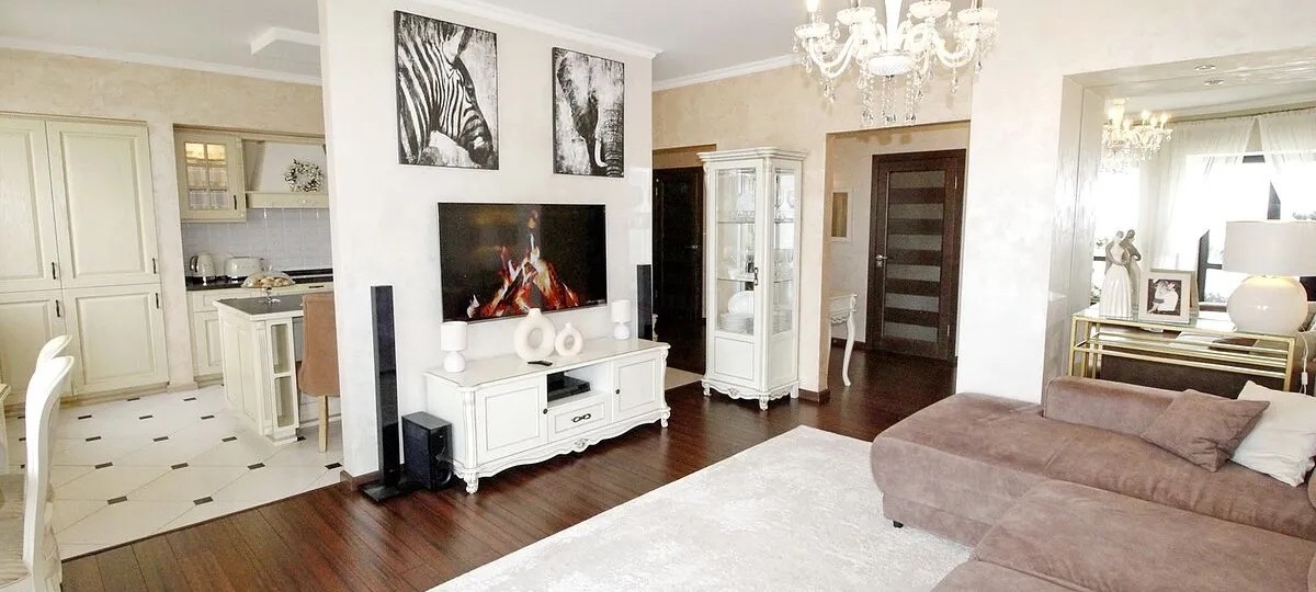 Как пишут в объявлении, в квартире выполнен дорогостоящий ремонт с использованием высококачественных материалов. Все комнаты светлые, с мебелью и аксессуарами в одном стиле. В квартире много зеркал, что придает больше воздуха пространству.