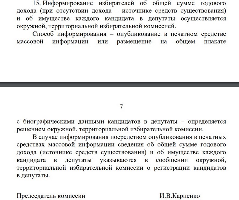 В случае информирования посредством опубликования в печатных средствах массовой информации сведения об общей сумме годового дохода (источнике средств существования) и об имуществе каждого кандидата в депутаты указываются в сообщении окружной, территориальной избирательной комиссии о регистрации кандидатов в депутаты».