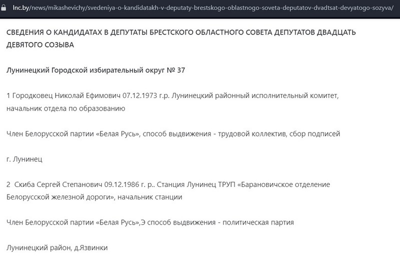 Дальше мы изучили сайты 16 райисполкомов Брестской области и сайты горисполкомов Бреста, Барановичей и Пинска. Там тоже опубликованы списки кандидатов депутаты, их предвыборные программы, информация о специальных избирательных счетах. Но сведений об их доходах и имуществе тоже нет. Опубликовали только дату рождения, место работы, партийность, способ выдвижения и место жительства.