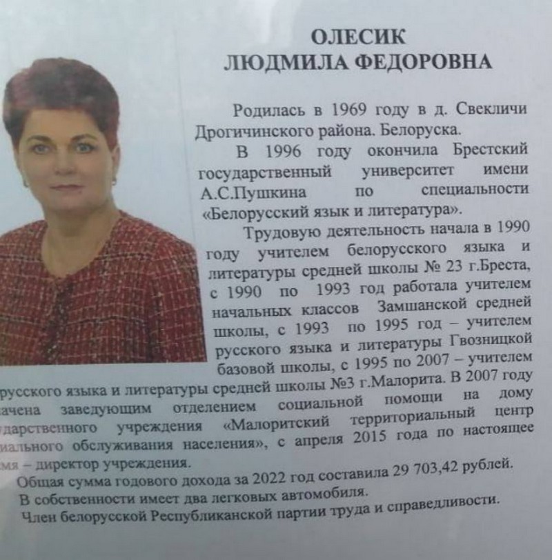 Она работает директором Малоритского территориального центра социального обслуживания населения. Согласно этому плакату, Людмила Олесик в 2022 году заработала 29 703,42 рубля. То есть в среднем в месяц она получала 2 475 рублей. Для сравнения, средняя начисленная зарплата в Беларуси за 2022 год составила 1 631 рубль, а после вычета налогов на руки получалось около 1 403 рублей.