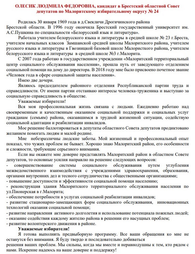 В Малоритском районе избирательная комиссия решила опубликовать данные о доходах кандидатов в депутаты на их плакатах. Мы нашли плакат кандидата в депутаты Брестского областного Совета депутатов по Малоритскому избирательному округу №24 Людмилы Олесик.