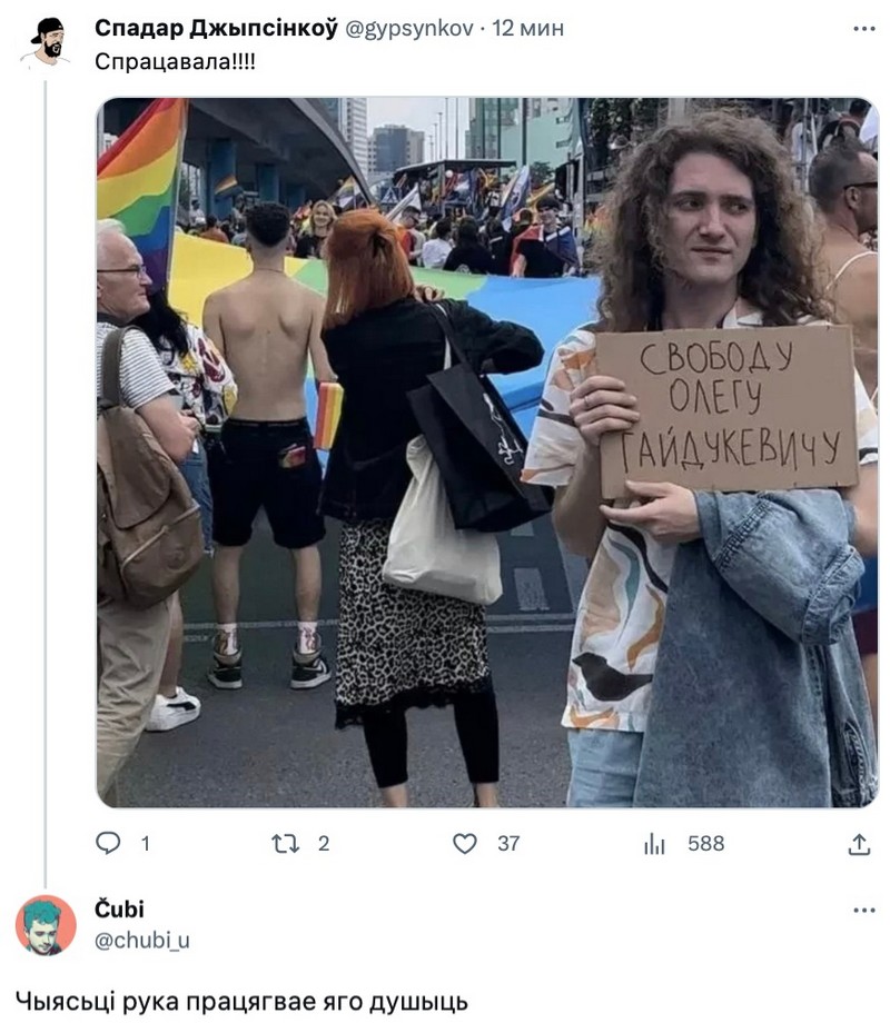 Кто-то, в том числе и мы, сразу вспомнил беларуского блогера Глеба Семенова, который летом этого года на марше в поддержку ЛГБТ в Варшаве вышел с плакатом «Свободу Олегу Гайдукевичу».