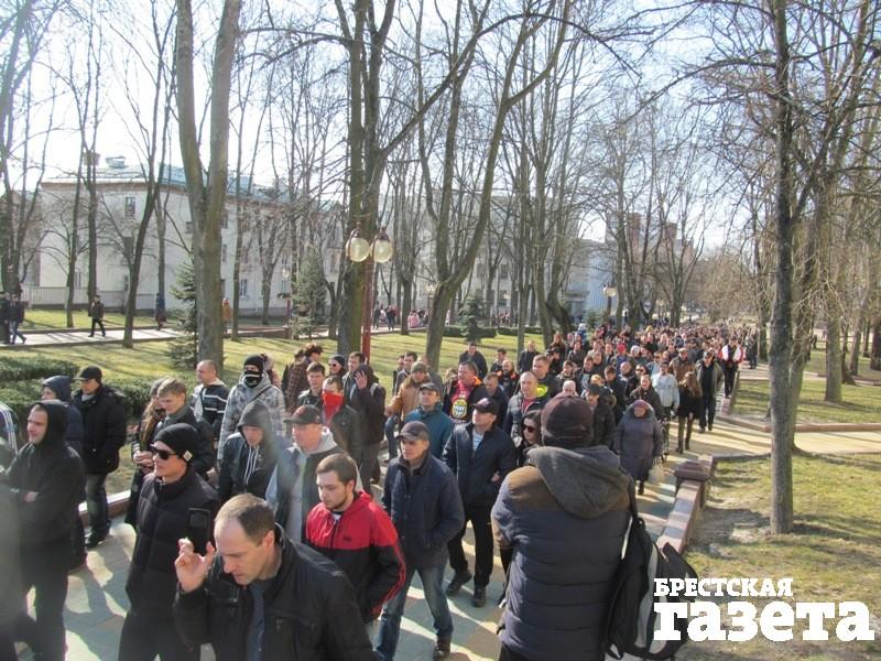 Участники акции идут по ул. Пушкинской. Маршрутки и другие машины сигналят. Повернули на Советскую. Начало колонны — у ТЦ «Дидас Персия», хвост — у «Белтелекома». Люди скандируют «Нет декрету №3», «Нет зарплаты, есть налог — депутату в кошелек», «Настоящий дармоед — тот, кто выдумал декрет» и хлопают, привлекая внимание прохожих.