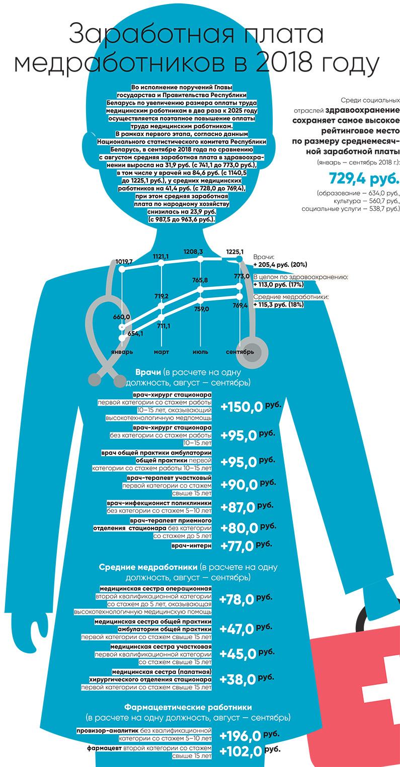 Согласно данным Национального статистического комитета Республики Беларусь, в сентябре 2018 года по сравнению с августом 2018 года средняя заработная плата в здравоохранении выросла на 31,9 руб. (с 741,1 до 773,0 руб.), в том числе у врачей на 84,6 руб. (с 1 140,5 до 1 225,1 руб.), у средних медицинских работников на 41,4 руб. (с 769,4 до 721,9). При этом средняя заработная плата по народному хозяйству снизилась на 23,9 руб. (с 987,5 до 963,6 руб.).