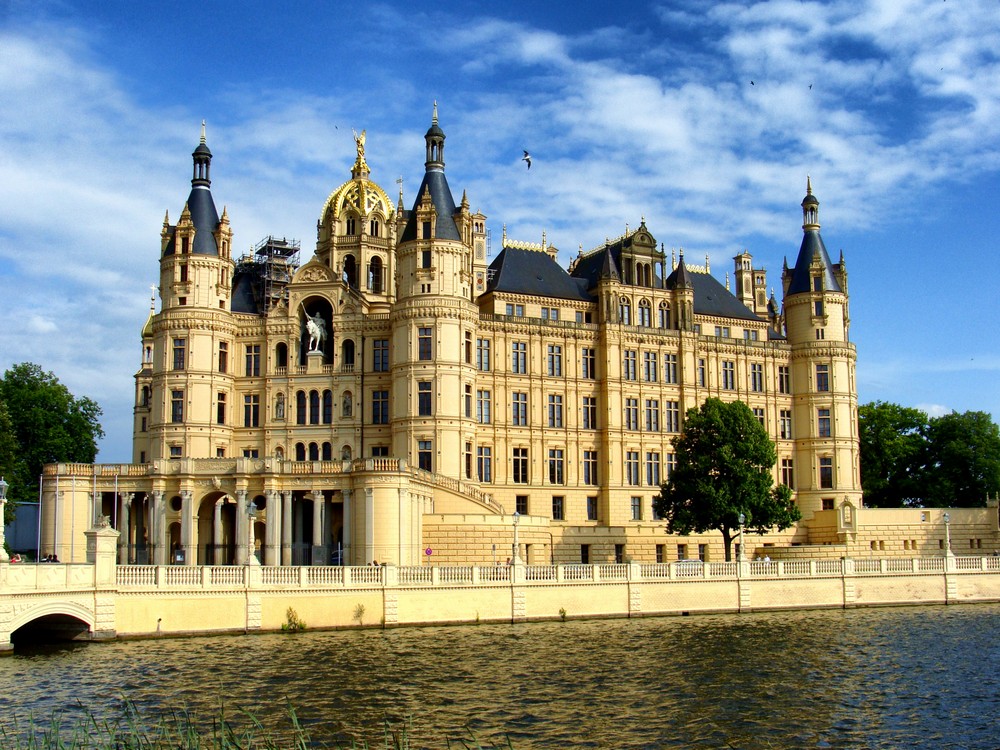 Резиденция главы Мекленбургского дома была построена на Дворцовом острове в Шверине в стиле романтического историзма в 1845-1857 годах. В эпоху барокко и позже рвы и пруды окончательно стали элементами ландшафтной архитектуры, а не фортификации, как это было в Средние века. В качестве образцов для подражания были выбраны ренессансные замки Франции.