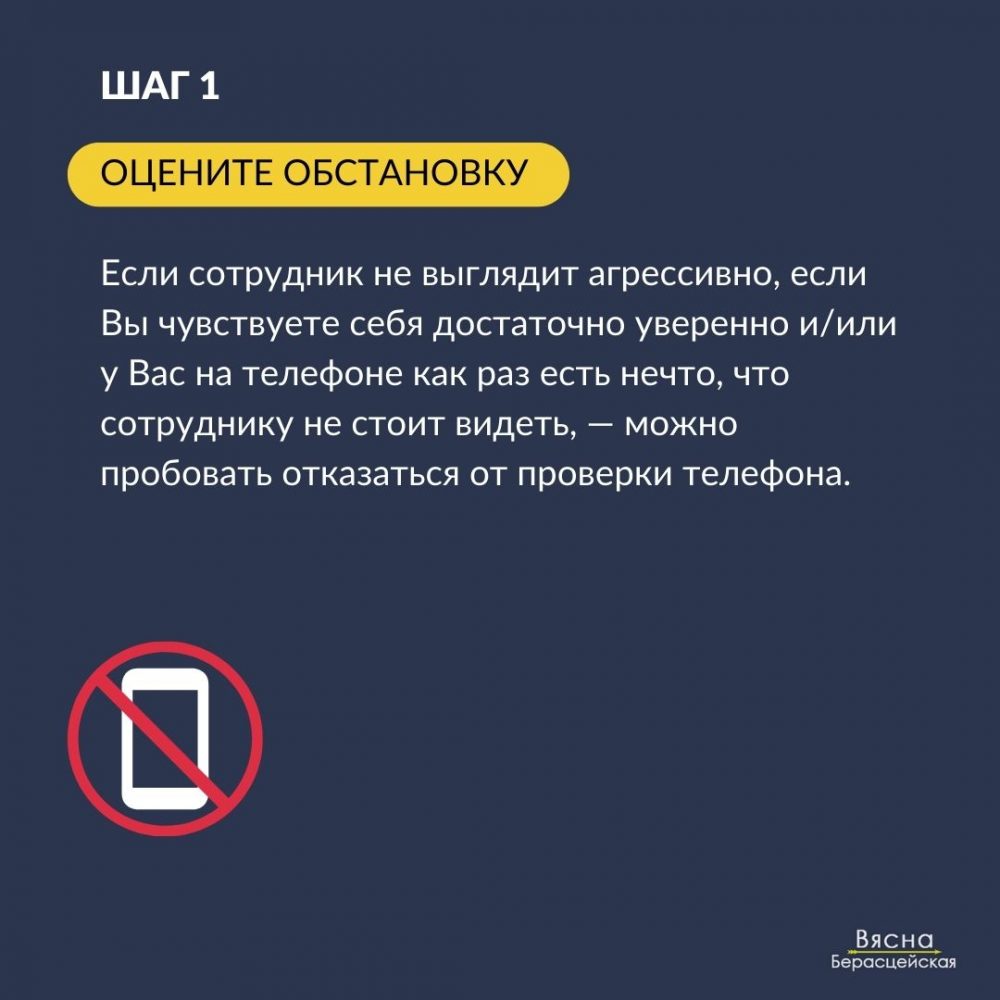 Разумеется, в стране в состоянии «не до законов» отстаивать свои права бывает опасно. На карточках приводим алгоритм брестской «Весны», что делать, если силовик просит разблокировать телефон и отдать ему. Делитесь этой памяткой с теми, кому она может пригодиться.