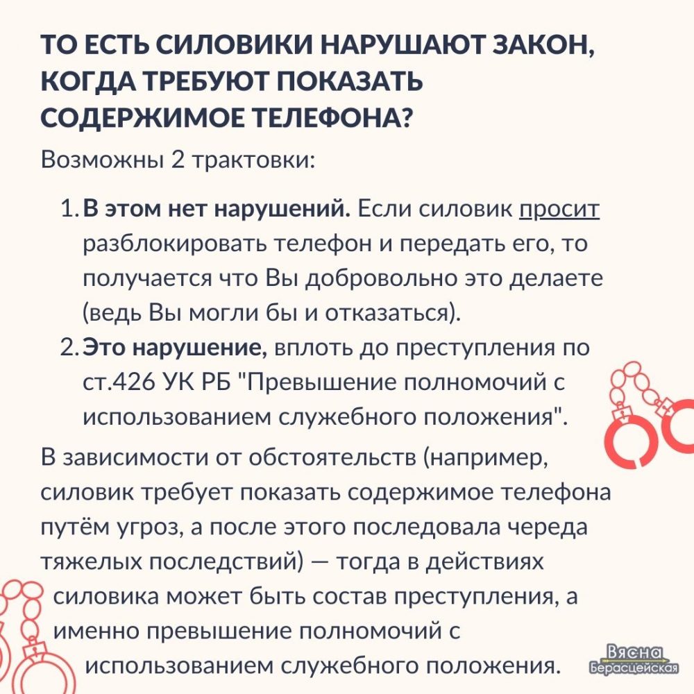 «Нам известно немало случаев, когда силовик просил разблокировать телефон и дать на проверку, человек отказывался — и… ему за это ничего не было. Нам, правозащитникам, обычно такие истории рассказывают с комментарием в духе «представьте, до чего я обнаглел, и это сработало»», — пишет брестская «Весна».