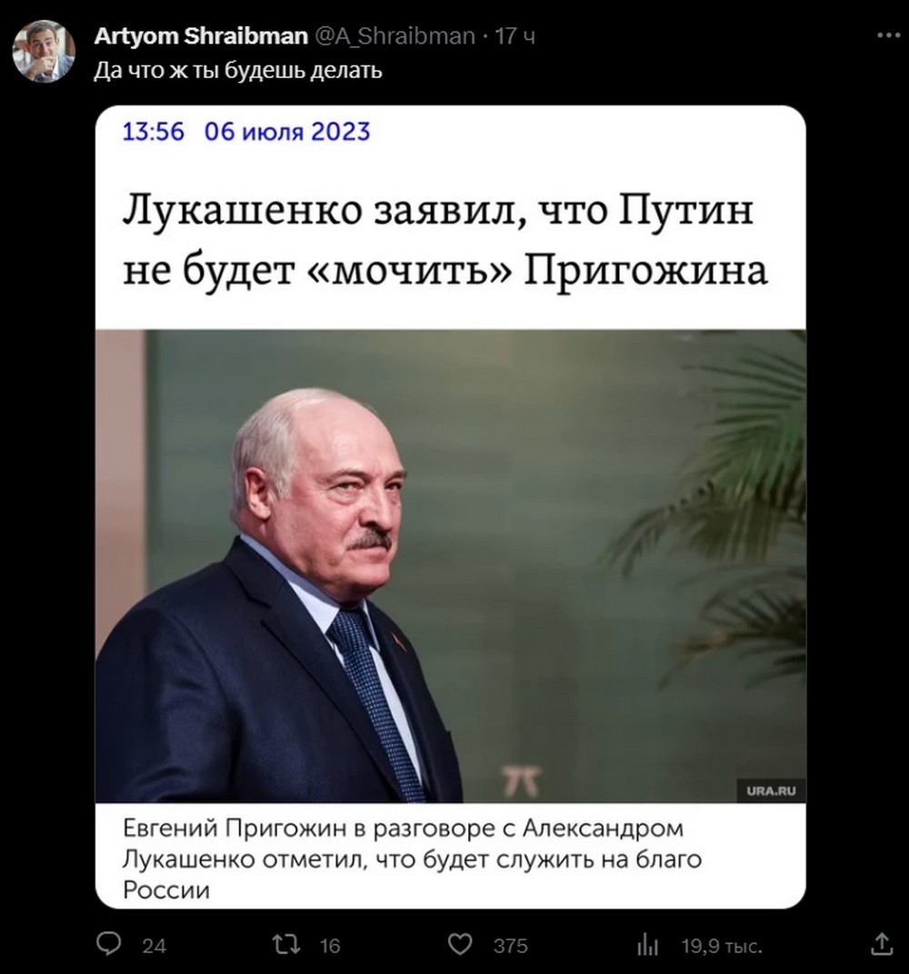 Беларусы в основном вспоминали гарантии Александра Лукашенко, что Владимир Путин не станет «мочить» Евгения Пригожина.