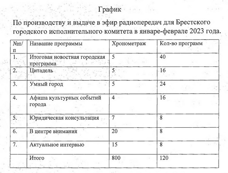 Больше всего Брестский горисполком тратит на новостные телепрограммы, которые выходят со вторника по субботу по вечерам. Их задача — освещать деятельность горисполкома и события, которые происходят в нашем городе.
