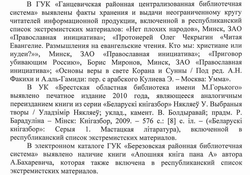 Например, в библиотечной системе Барановичей выявлено научно-популярное издание «Горькие годы: Трагедия Западной Беларуси 1944-1954» под авторством Александра Татаренко. По мнению прокуратуры, издание «содержит описание истории с указанием событий, искажающих, фальсифицирующих историческую правду белорусского государства в пользу современных западных политических представителей».
