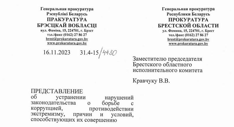 Читатели прислали редакции BGmedia письмо Прокуратуры Брестской области заместителю председателя Брестского облисполкома Вадиму Кравчуку от 16 ноября этого года. Называется оно «Представление об устранении нарушений законодательства о борьбе с коррупцией, противодействии экстремизму, причин и условий, способствующих их совершению».