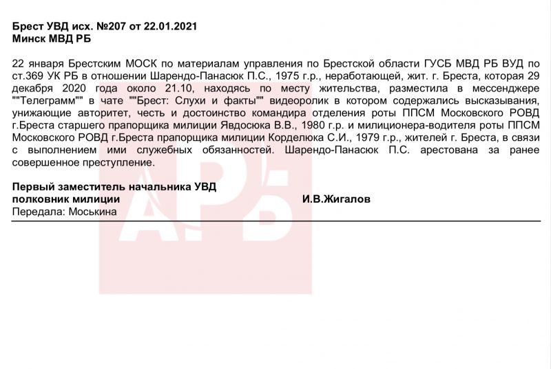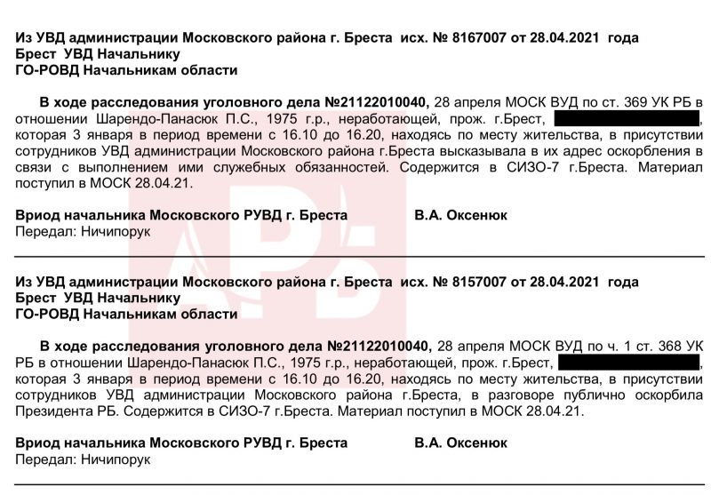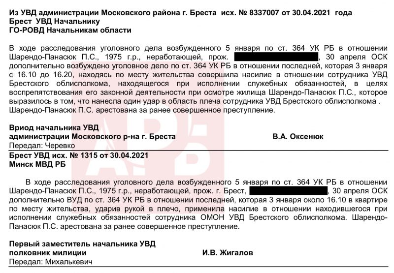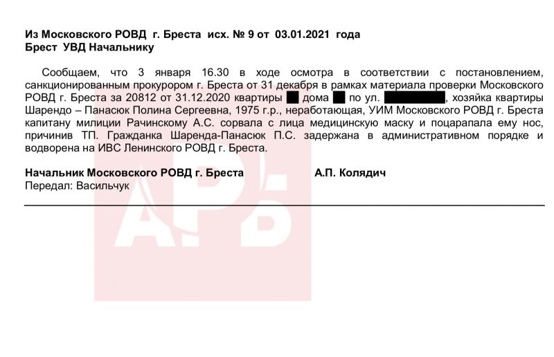 3 января 2021 года начальник Московского РОВД Бреста полковник Анатолий Колядич рапортует в областное УВД, что Шарендо-Панасюк Полина Сергеевна, находясь у себя дома, сорвала с лица участкового инспектора милиции Московского РОВД Бреста капитана милиции Рачинского А.С. медицинскую маску и поцарапала ему нос, чем причинила телесные повреждения. За это ее задержали в административном порядке по печально известной статье 23.4 КоАП РБ и поместили в ИВС Ленинского РОВД Бреста.