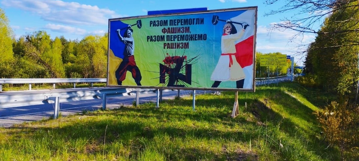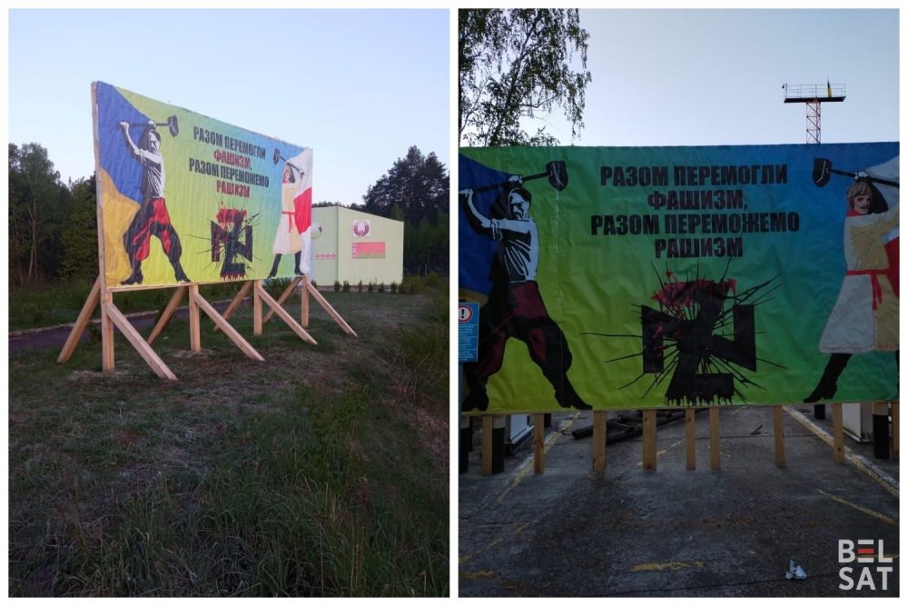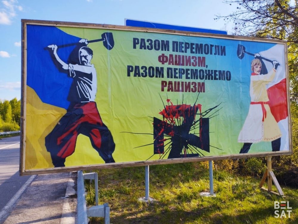 «Разом перемогли фашизм, разом переможемо рашизм», — написано на билбордах, направленных в сторону беларусских пограничников. На них изображения людей под желто-голубым и бело-красно-белым флагами.