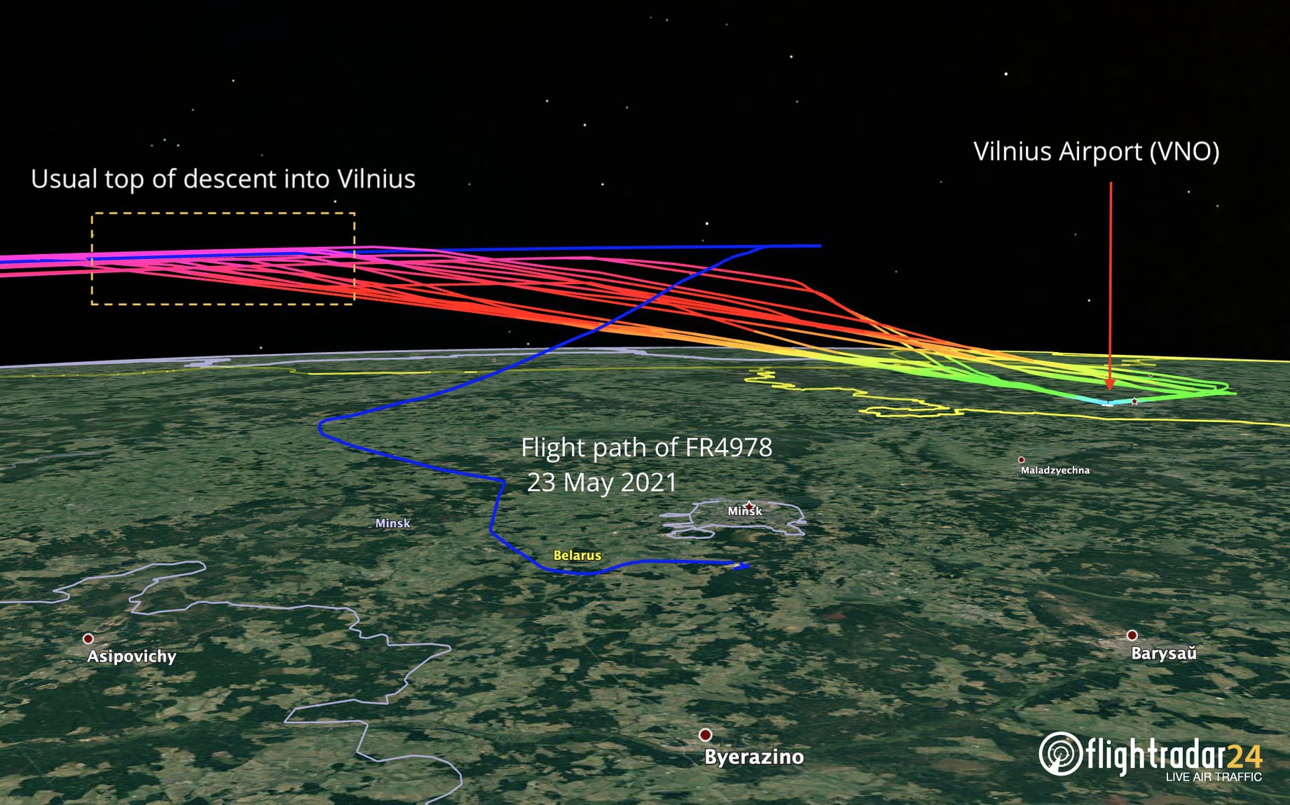 «Но в этот раз (синяя траектория рейса ATH-VNO Ryanair) пилоты шли в сторону Литвы без снижения и сброса скорости, на крейсерском эшелоне FL 390 и крейсерской скорости, т. е. фактически уходили от преследовавшего их истребителя, и повернули назад всего за две минуты до пересечения литовской границы», – пишет эксперт.