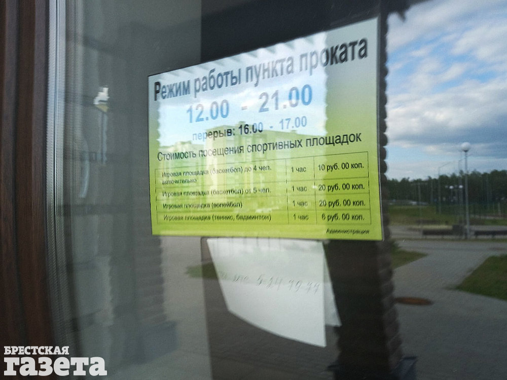 Оказалось, что даже тем, кто готов заплатить за удовольствие сыграть с друзьями, скажем, в волейбол, нужно пройти целый квест. На окне административного здания, где принимают оплату за посещение спортивных площадок, есть табличка с графиком работы. Рядом мы нашли номер телефона, как позже выяснилось, кассира.