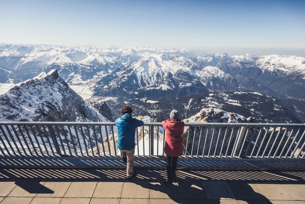 С вершины открывается вид на сразу четыре страны: Германия, Австрия, позади виднеется Италия и Швейцария. Кроме этого, на средней станции Zugspitzplatt можно перекусить, выпить пива и даже покататься на санках.