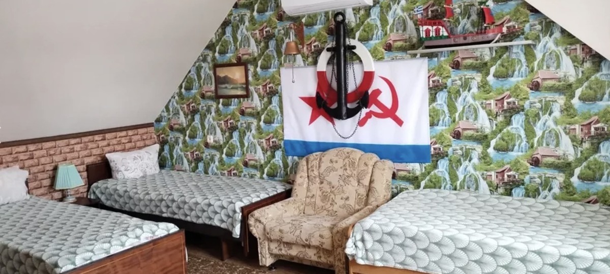 На эту мини-гостиницу в Красном Дворе мы наткнулись совершенно случайно, подыскивая варианты на новогоднюю ночь. Но об этом чуть позже. Первое, что привлекло внимание — фото с флагом на стене, на котором изображены серп, молот и звезда.
