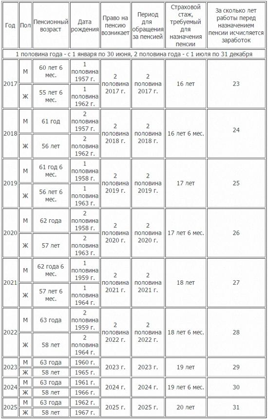 Со второго полугодия 2017 года пенсию будут назначать мужчинам, которые родились с 1 января по 30 июня 1957 года, и женщинам, родившимся с 1 января по 30 июня 1962 года; в 2018 году для мужчин — 61 год (во втором полугодии пенсия может быть назначена рожденным с 1 июля по 31 декабря 1957 года), для женщин — 56 лет (во втором полугодии пенсия может быть назначена рожденным с 1 июля по 31 декабря 1962 года); в 2019 году для мужчин — 61 год 6 месяцев (во втором полугодии пенсия может быть назначена рожденным с 1 января по 30 июня 1958 года), для женщин — 56 лет 6 месяцев (во втором полугодии пенсия может быть назначена рожденным с 1 января по 30 июня 1963 года); в 2020 году для мужчин — 62 года (во втором полугодии пенсия может быть назначена рожденным с 1 июля по 31 декабря 1958 года), для женщин — 57 лет (во втором полугодии пенсия может быть назначена рожденным с 1 июля по 31 декабря 1963 года); в 2021 году для мужчин — 62 года 6 месяцев (во втором полугодии пенсия может быть назначена рожденным с 1 января по 30 июня 1959 года), для женщин — 57 лет 6 месяцев (во втором полугодии пенсия может быть назначена рожденным с 1 января по 30 июня 1964 года); с 2022 года пенсии будут назначать мужчинам в 63 года, женщинам — в 58 лет.