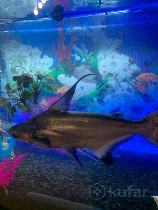 Длина особи около 35 см. Как пишет сам продавец: «:Завораживающее зрелище. Ощутите массу незабываемых впечатлений, имея у себя в аквариуме пангасиуса! Неприхотлив в уходе».