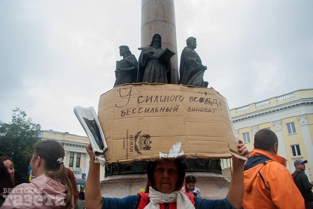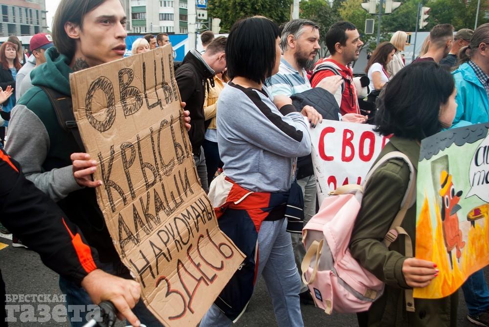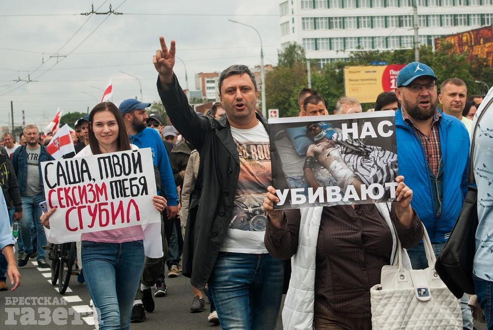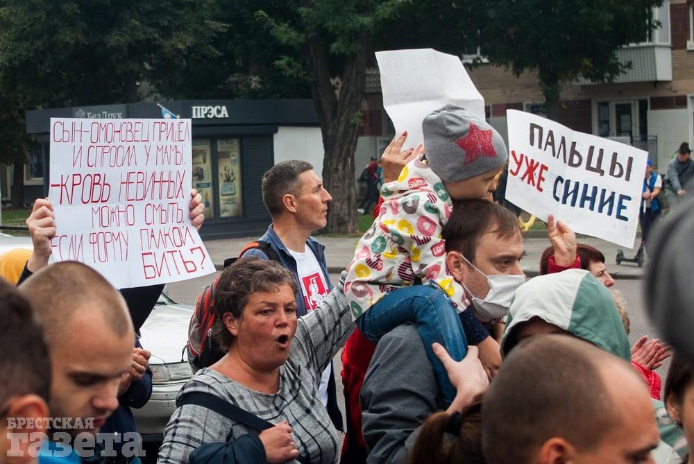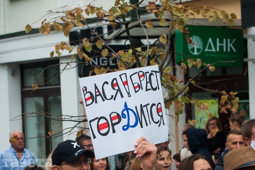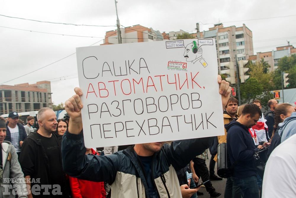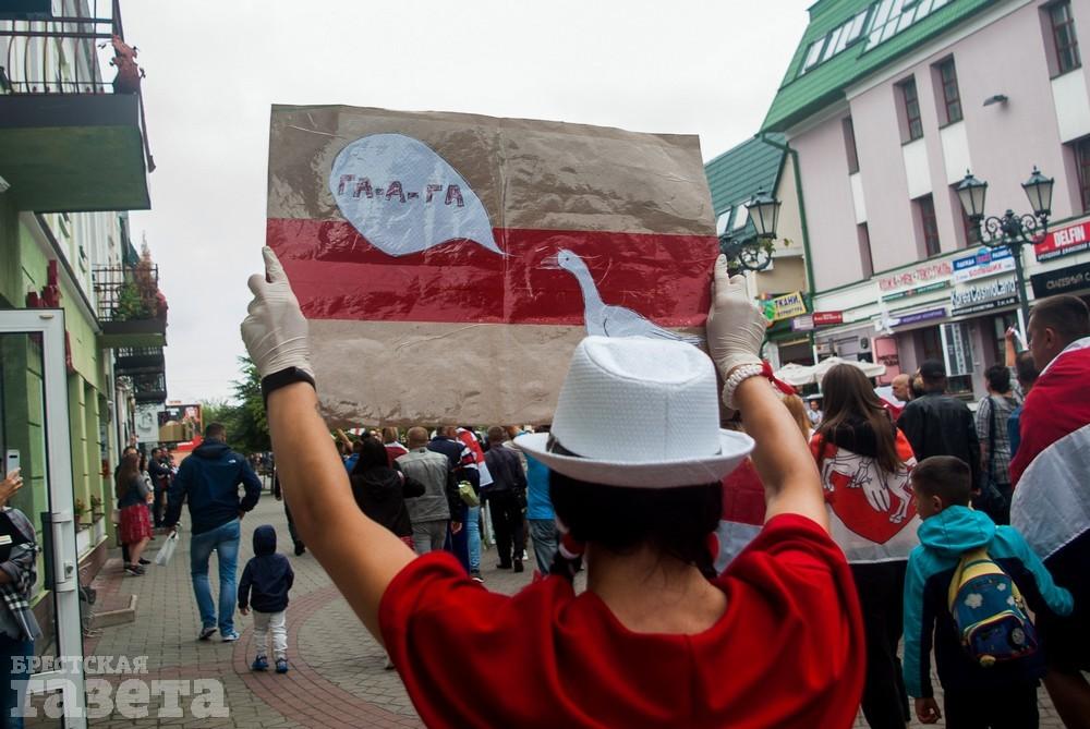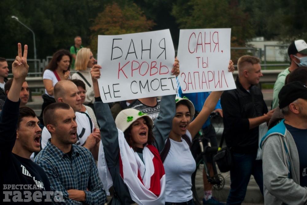 «Баня кровь не смоет», «Саня, ты запарил», «На наши налоги вскормил гестапо», «Вася! Брест гордится!» (в поддержу тренера Василия Хомутовского — прим. ред.), «Овцы, крысы, алкаши, наркоманы здесь», «Іду, бо накіпела», «Саша, твой сексизм тебя сгубил» — эти и другие надписи можно было сегодня увидеть на плакатах в Бресте.