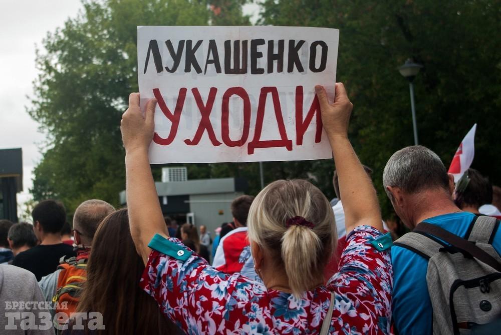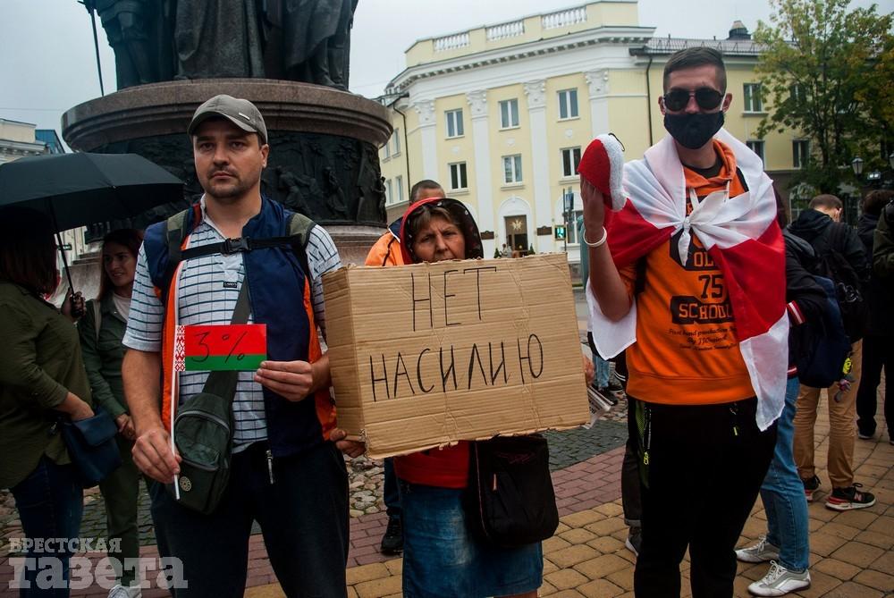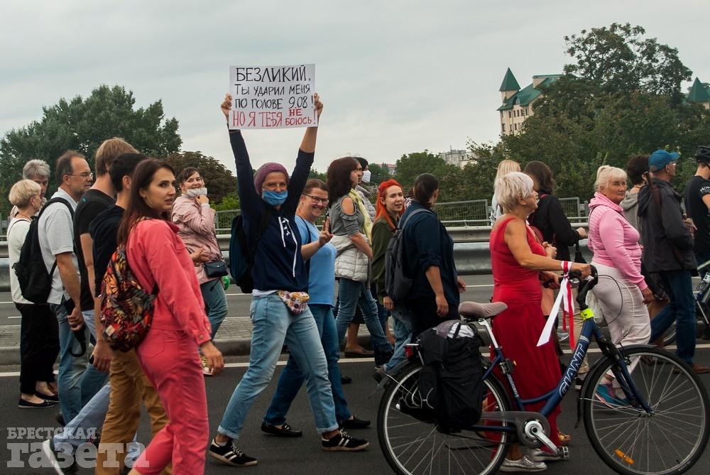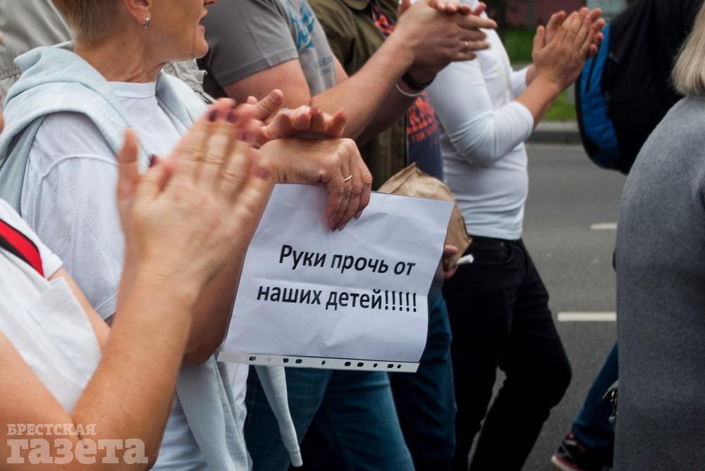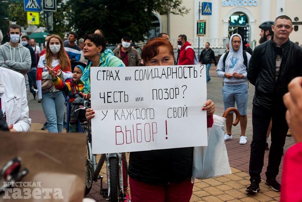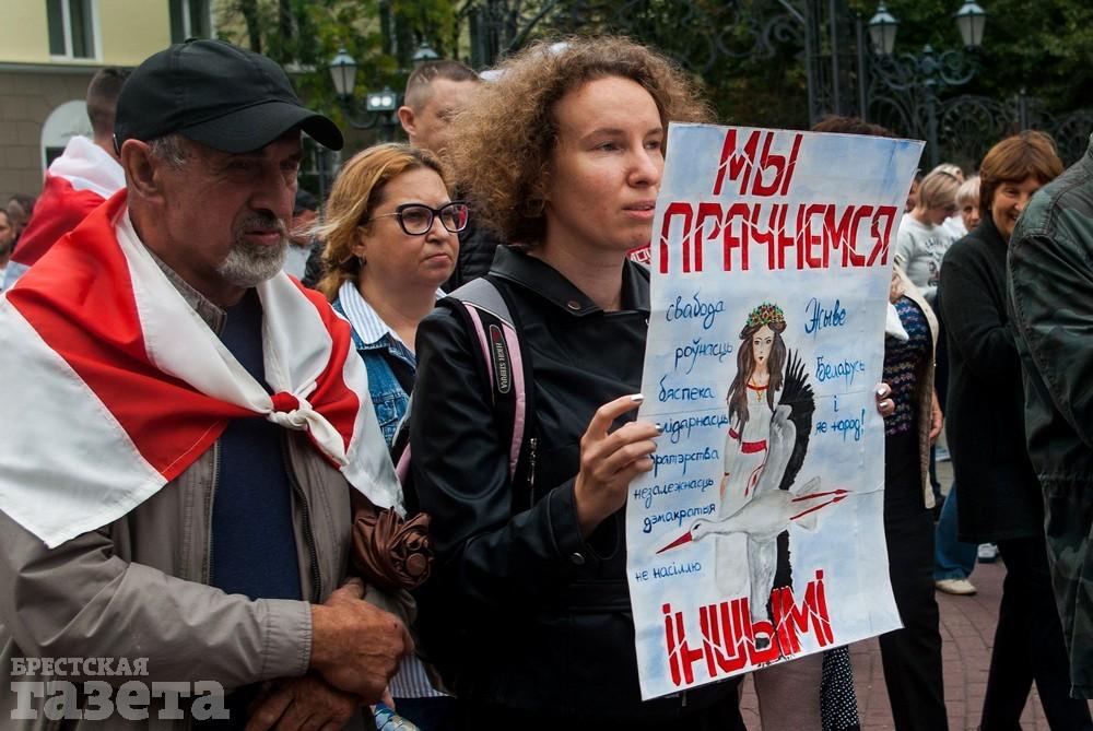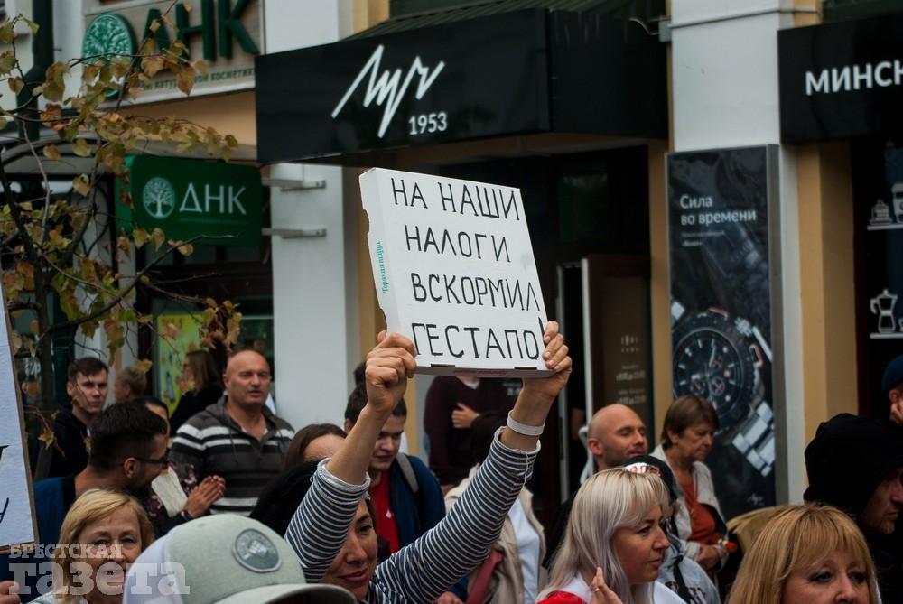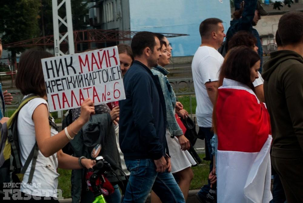 «Баня кровь не смоет», «Саня, ты запарил», «На наши налоги вскормил гестапо», «Вася! Брест гордится!» (в поддержу тренера Василия Хомутовского — прим. ред.), «Овцы, крысы, алкаши, наркоманы здесь», «Іду, бо накіпела», «Саша, твой сексизм тебя сгубил» — эти и другие надписи можно было сегодня увидеть на плакатах в Бресте.