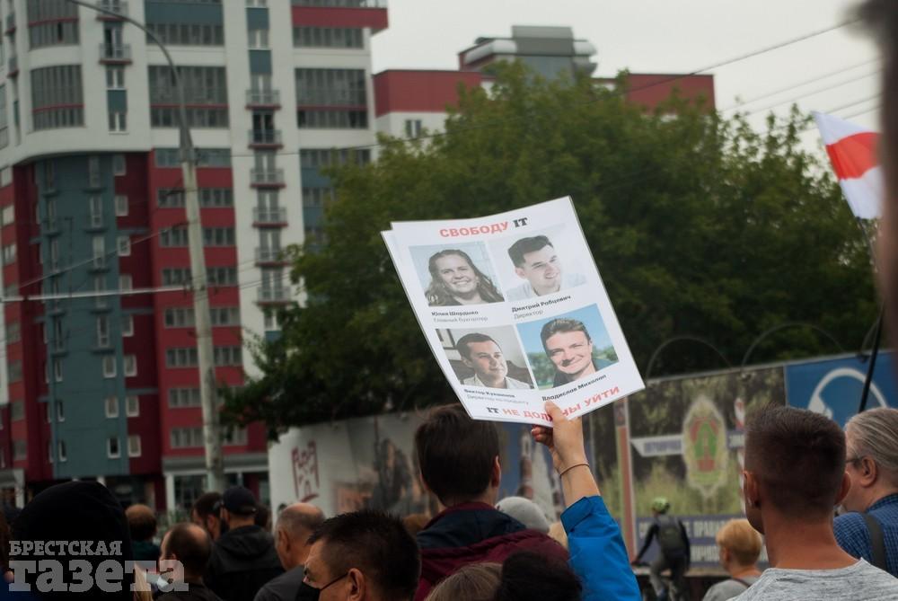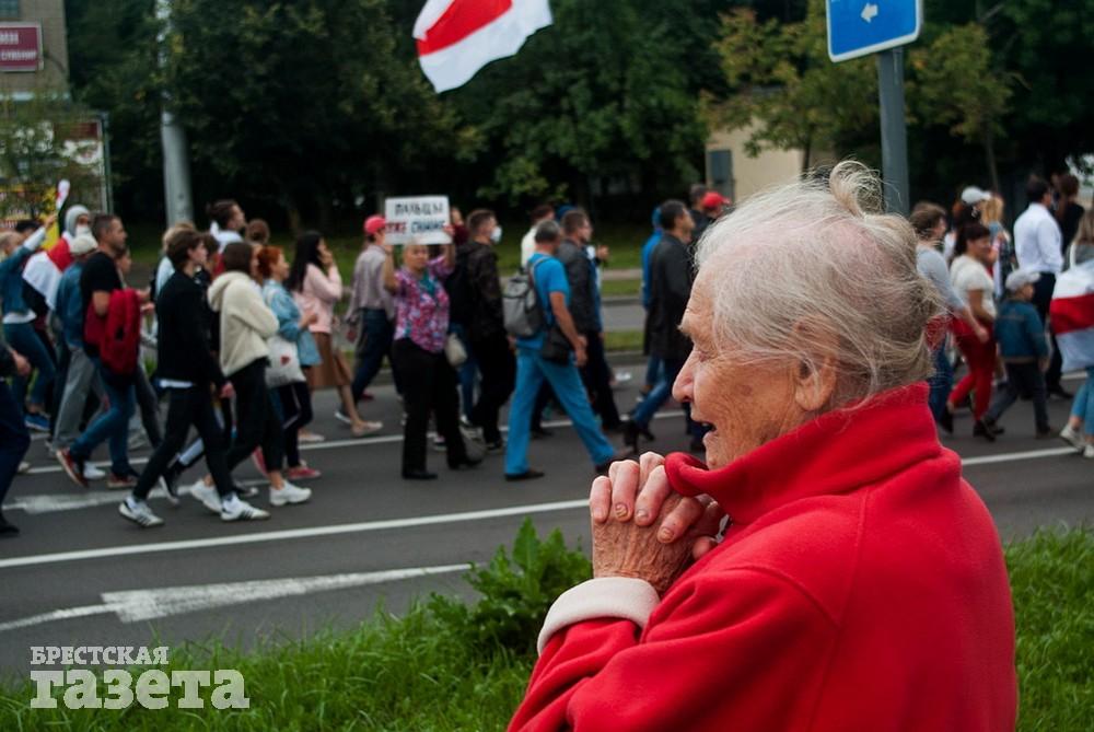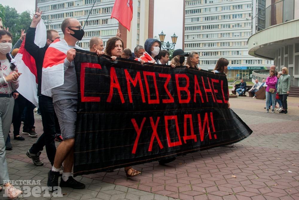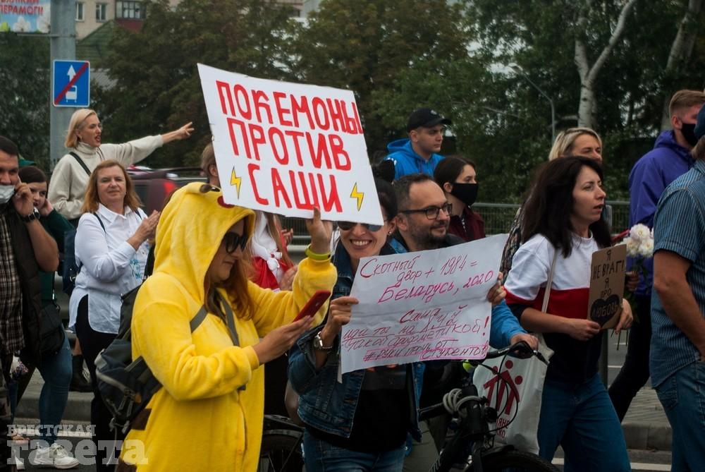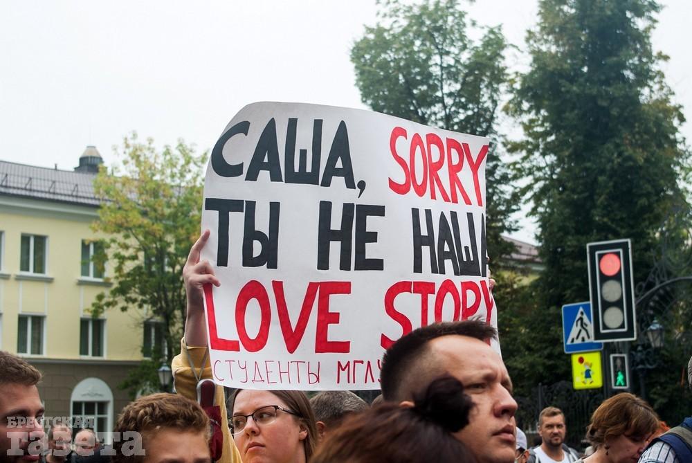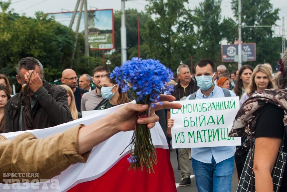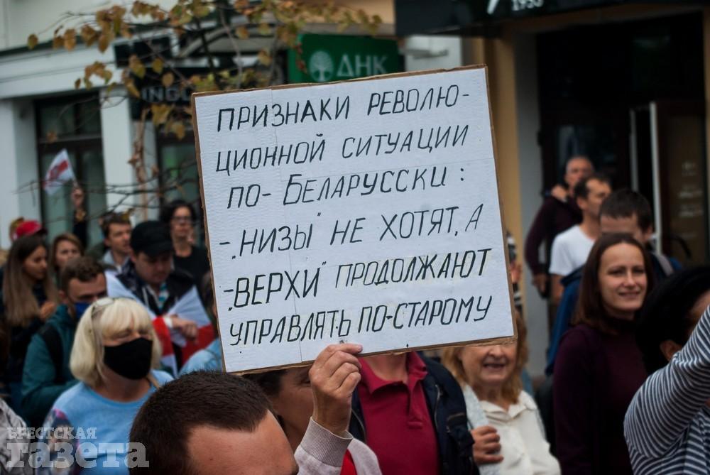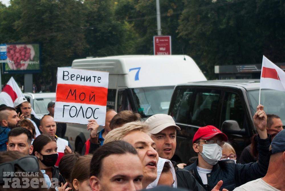 «Баня кровь не смоет», «Саня, ты запарил», «На наши налоги вскормил гестапо», «Вася! Брест гордится!» (в поддержу тренера Василия Хомутовского — прим. ред.), «Овцы, крысы, алкаши, наркоманы здесь», «Іду, бо накіпела», «Саша, твой сексизм тебя сгубил» — эти и другие надписи можно было сегодня увидеть на плакатах в Бресте.