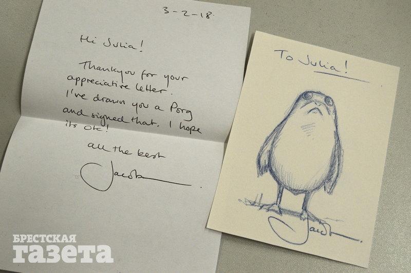 Иногда звезды присылают не просто автограф, а целое послание. Кто-то поздравляет с днем рождения, если сообщить об этом в письме. Кто-то вкладывает дополнительное фото от себя, сыплет блестки в конверт, рисует иллюстрации. Аниматор «Звездных войн», например, нарисовал Юлии от руки порга (персонаж «Звездных войн» — прим. авт.).