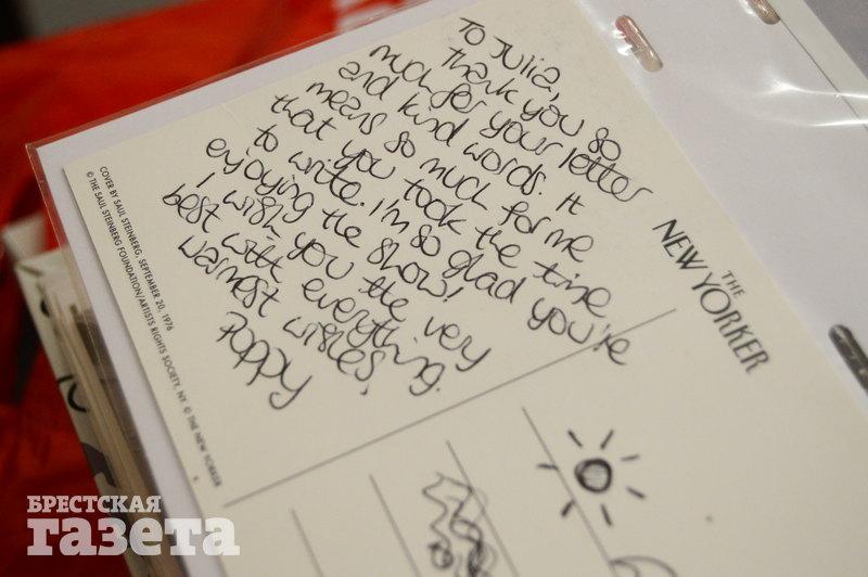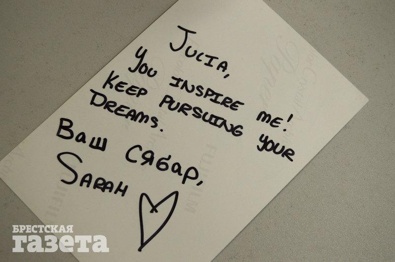 «Я очень люблю свою страну и поэтому в каждом письме пишу пару слов о Беларуси», — добавила брестчанка. В ответ на такое послание Юлия получала письма, где на белорусском было написано «Прывiтанне» или «Ваш сябар», а кто-то из звезд выражал желание посетить Синеокую. Сейчас девушка в качестве эксперимента стала вкладывать в письма вопросники, которые заполняют знаменитости. А одной актрисе брестчанка отправила носки в консервной банке. Та в ответе написала: «Спасибо за твое письмо и носки. Никто никогда не отправлял мне носки».
