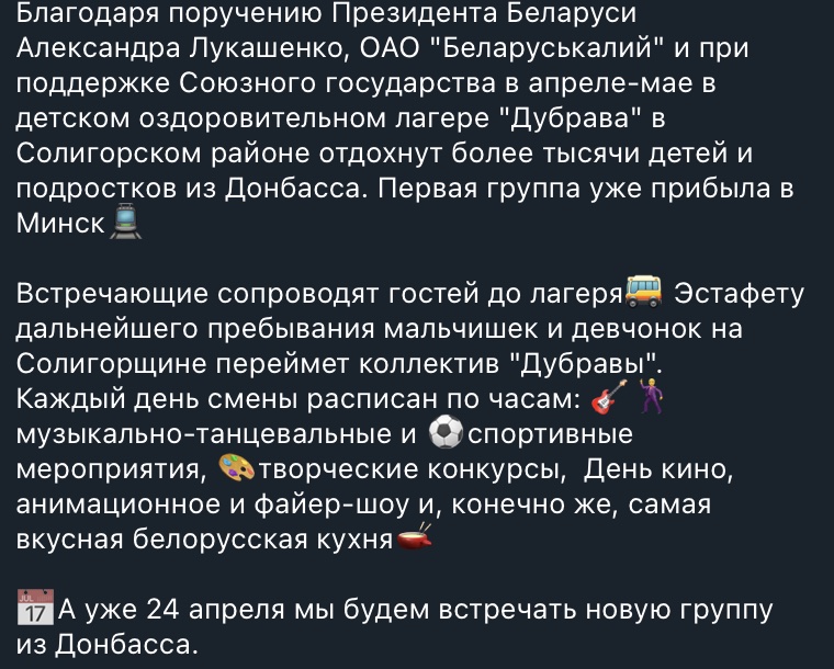 По информации главы НАУ Павла Латушко, речь идет о 1050 детях из оккупированной части Украины, которые в сентябре-октябре 2022 года прошли оздоровление в лагере «Дубрава» Солигорского района Минской области. Учреждение принадлежит предприятию ОАО «Беларуськалий», которое на данный момент находится под санкциями.
