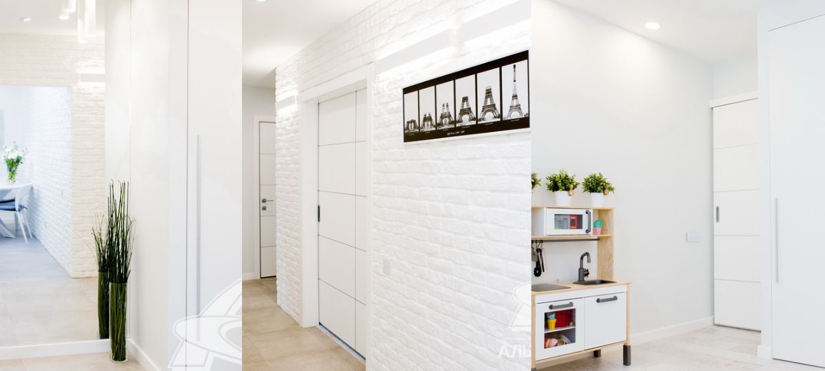 Трехкомнатная «белоснежка» расположена на седьмом этаже 10-тиэтажной «панельки» 2016 года постройки в юго-западной части города. Дизайн интерьера выполнен в белой ахроматической гамме. Как пишут авторы объявления «ультрасовременно выглядит сочетание разных материалов – глянцевых поверхностей, штукатурки и элементов кирпичной кладки». Чистые оттенки белого создают ощущение воздушного и светлого пространства.